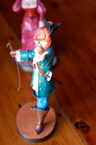The auctioneer measures 10″ tall by 5″ wide by 3 1/2″ deep. The Auctioneer features a brass earring, pewter sword, chain, and whip handle. The medallion is pewter and red glass. The whip is made of leather.