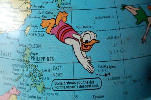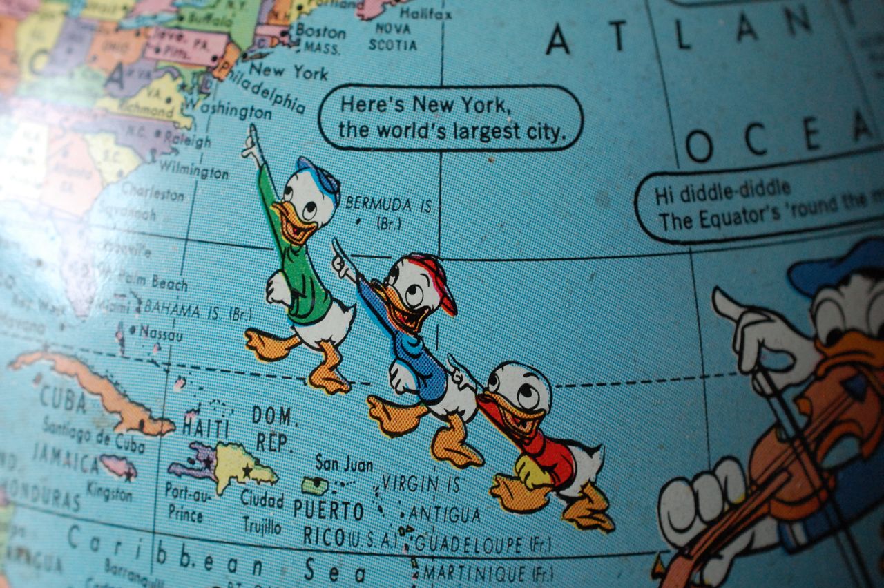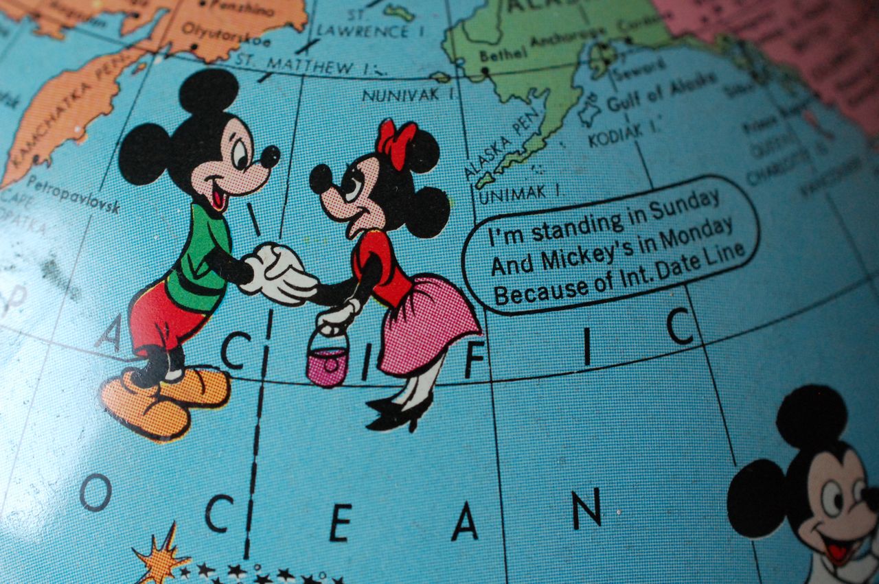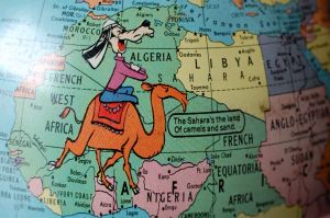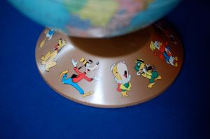 Then, the globe also shows Goofy riding a camel across French West Africa, which Wikipedia tells me was a federation that existed from 1895 until 1960. So, It had to be made somewhere between 1955 and 1960.