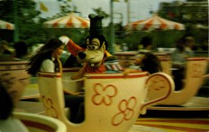 The older of the 2 cards featured in this post takes us all the way back to July, 1975, taking a spin on the Tea Cups with Goofy: