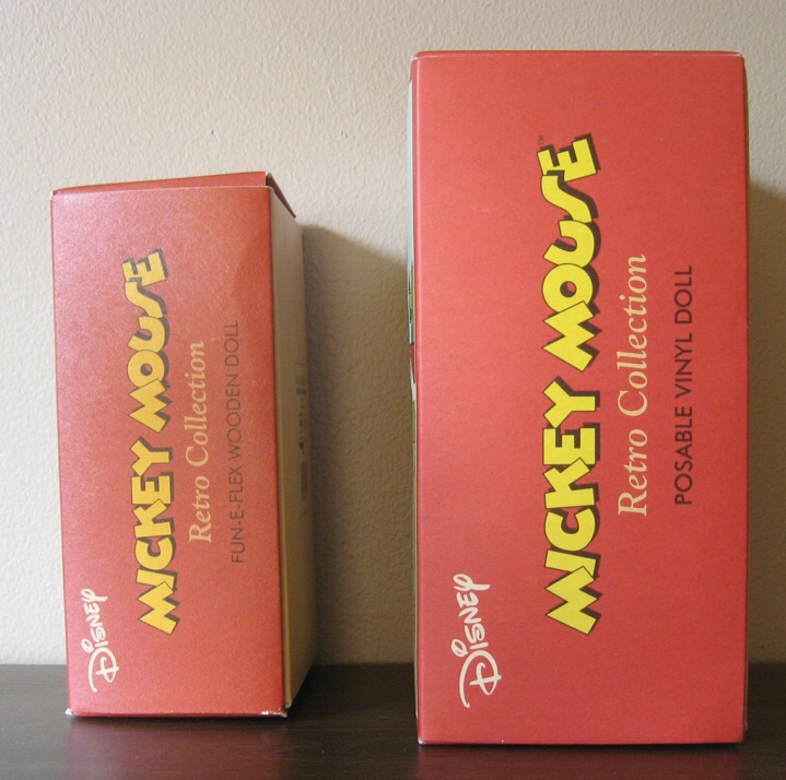 Look, they escaped the boxes! The wooden Flex-E Fun doll has a wooden body, hands and feet. The ears are felt and the arms are cotton-braided cord over flexible wire. His tail is just cotton cord. The vinyl doll is all vinyl (duh) except for his shorts.