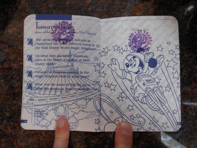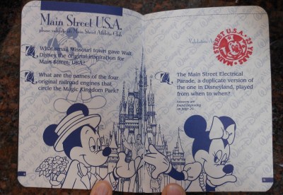 “Welcome to the 25th Anniversary Celebration at the Walt Disney World Resort! It’s a big year of celebration with festivities, parades, and special events continuing through 1997. While at the Magic Kingdom, guests can validate their passports at 8 key park locations (locations are identified on each of the pages). The passport is also packed full of great Magic Kingdom trivia. See how much you know!”