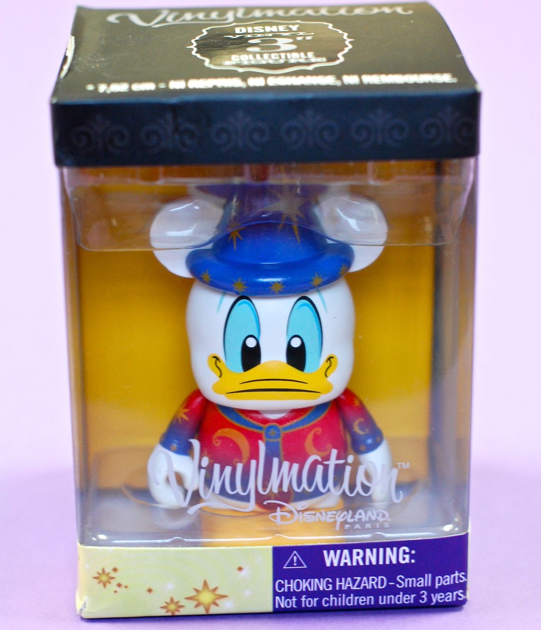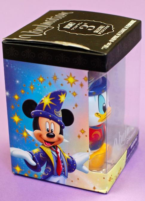 On my birthday, she presented me with 2 wrapped boxes that I immediately knew were Vinylmation, but I was completely taken by surprise by the actual items themselves! First up, let’s take a look at Donald. Donald is sporting a Sorcerer type hat, with a crescent moon adorned shirt and a tie: