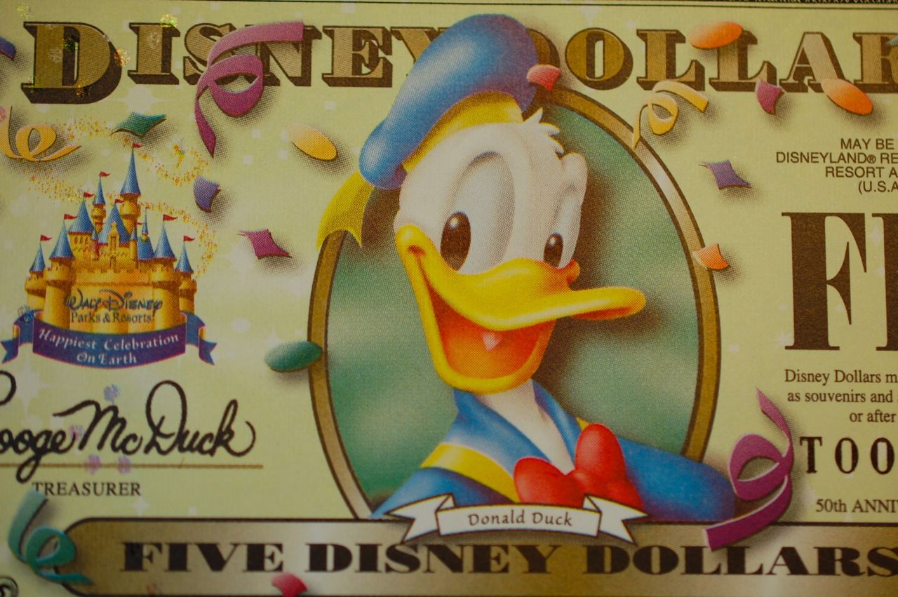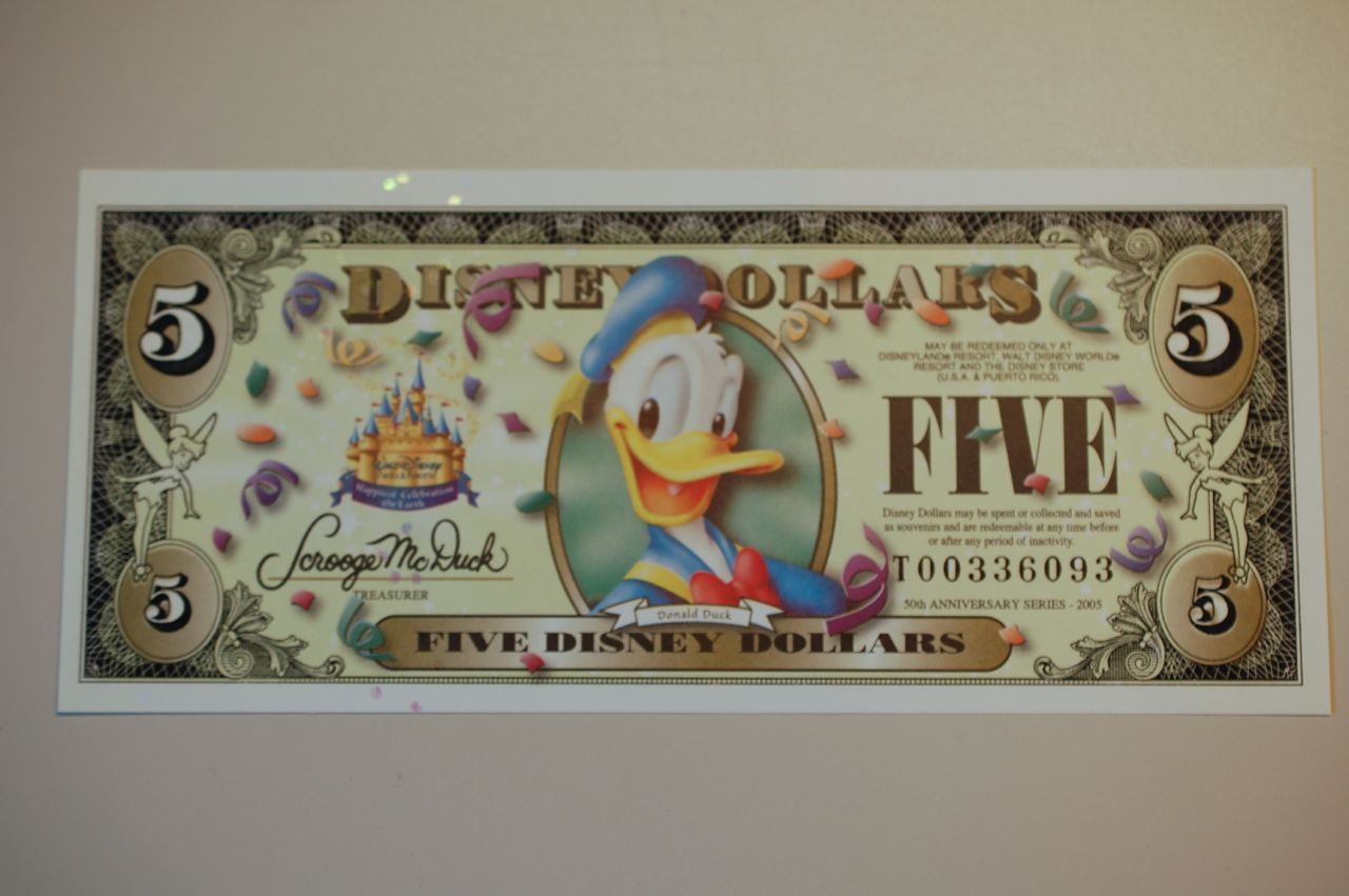 In 2005, Disneyland celebrated its 50th Anniversary, and there were commemorative Disney Dollars released in conjunction with this momentous occasion. Let’s start with the 5 dollar denomination, featuring Donald Duck.