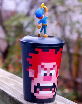 The figure comes off the top of the lid, but I’m going to display it just like this, as I dig the retro video game graphics on the cup.