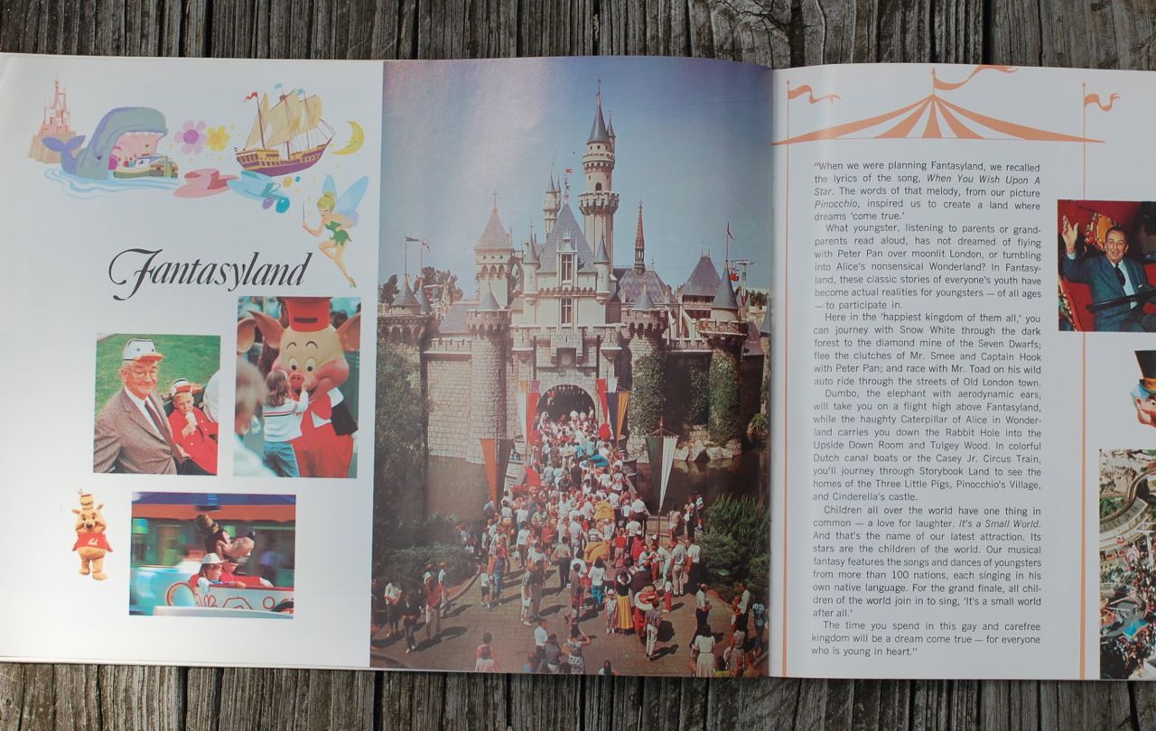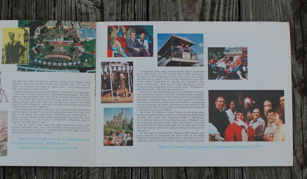 The inside front cover folds out, and on the this fold out and the 1st page we get a short history of the creation of Walt Disney’s “new concept in family entertainment”.