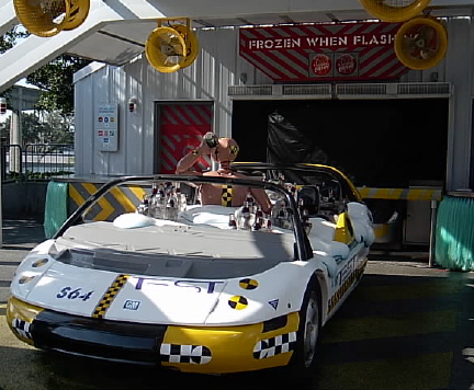 Here are a few places to get a free splash of water: World of Disney at DTD (Stitch will ‘spit’ on you for free); Splash Pad also at DTD (just outside the Disney Design-a-Tee store); Outside Star Tours in Disney’s Hollywood Studios (an Imperial Walker will ‘shoot’ you for free); Test Track Cool Wash at Epcot (see pic below).