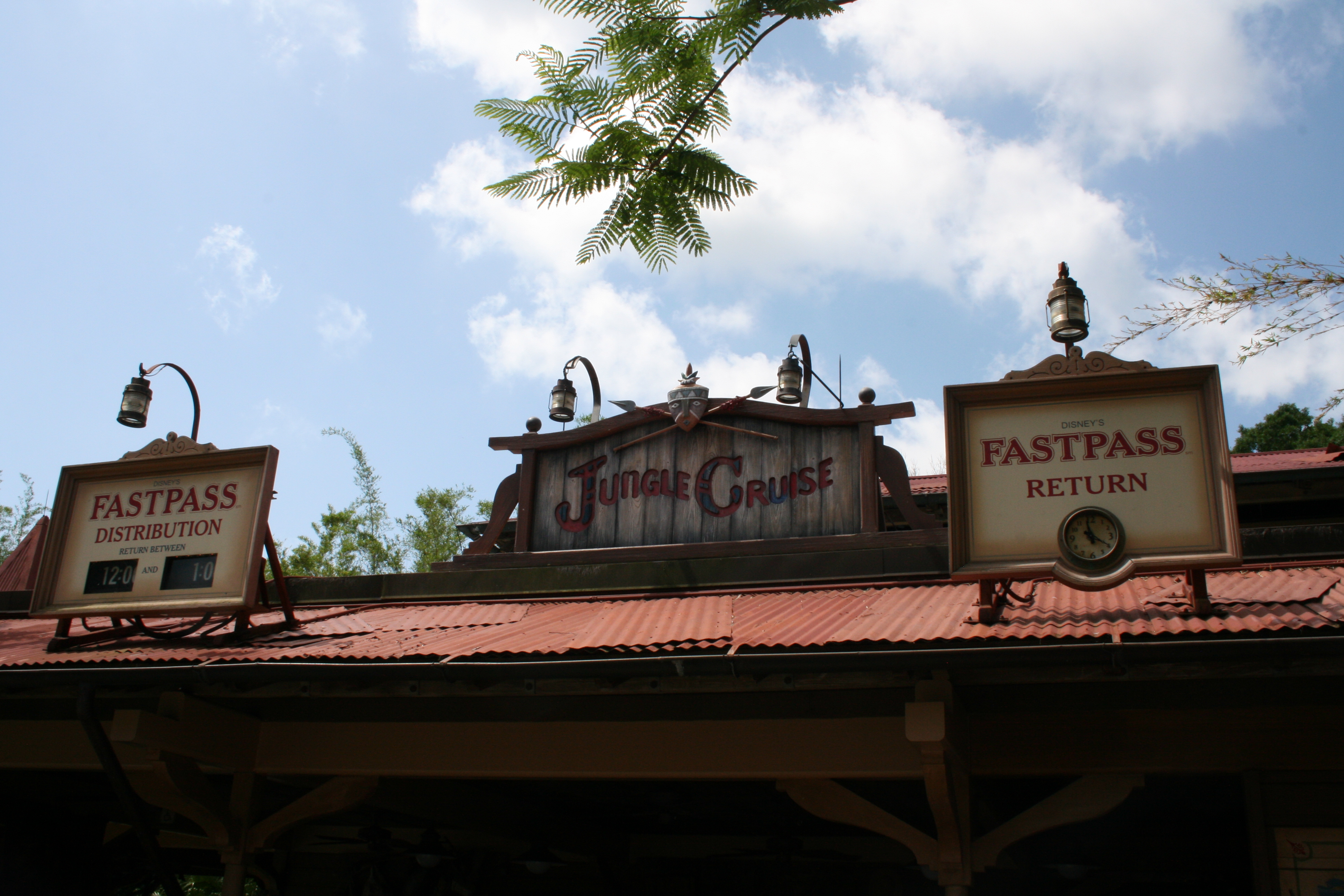 The boat in the movie is called ‘African Queen’, but the boats in the Jungle Cruise attractions have a variety of names. In Disneyland, the queue and station are themed as the headquarters and boathouse of a River Expedition Company, located in a (presumably British) colony of the 1930s. And I believe the names presently in use are: