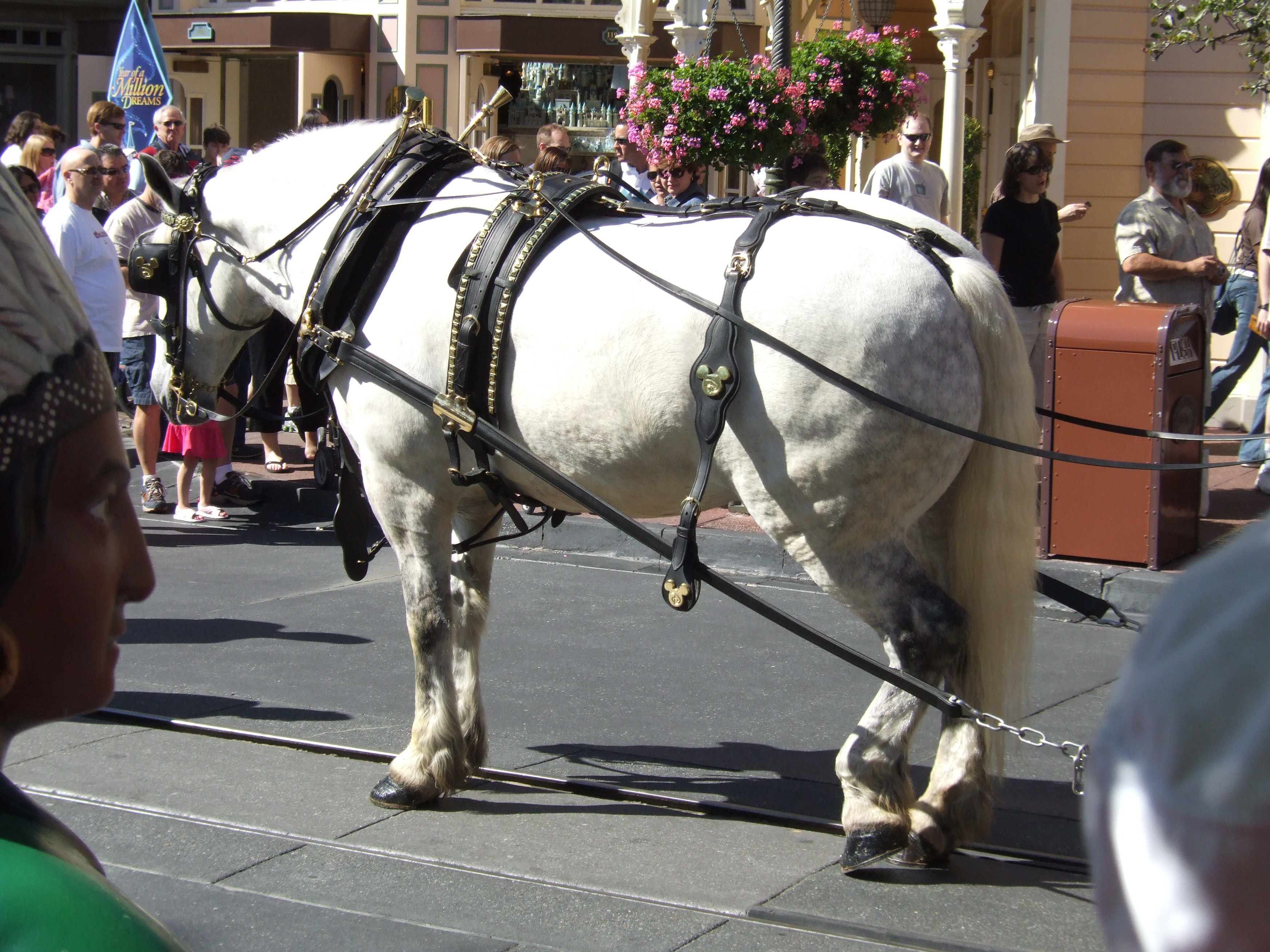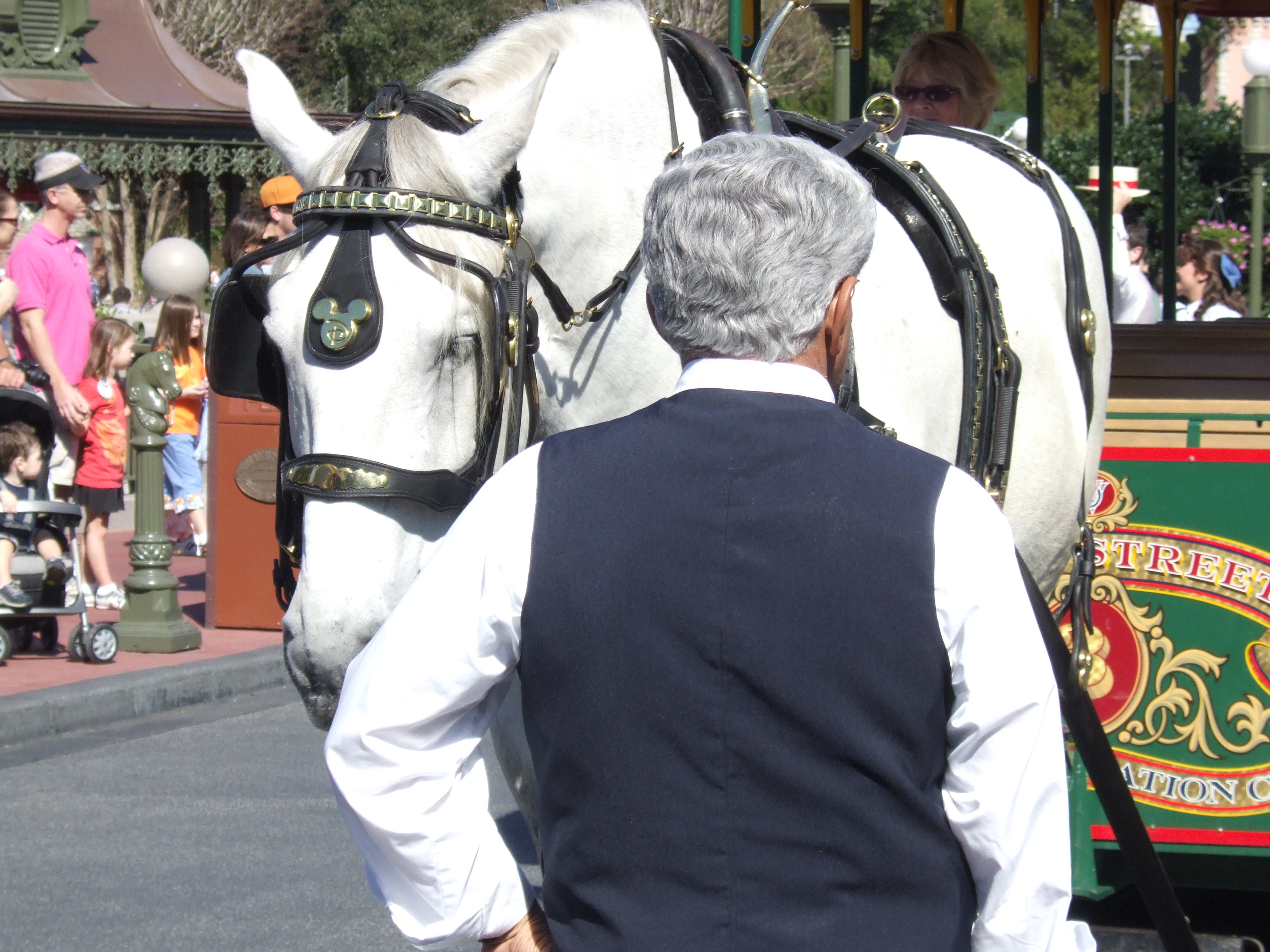 Main Street in the Magic Kingdom is a very special place, and one where you can always find a horse or two. This beautiful animal was just starting his shift as he pulled the tram out to a waiting crowd of guests.