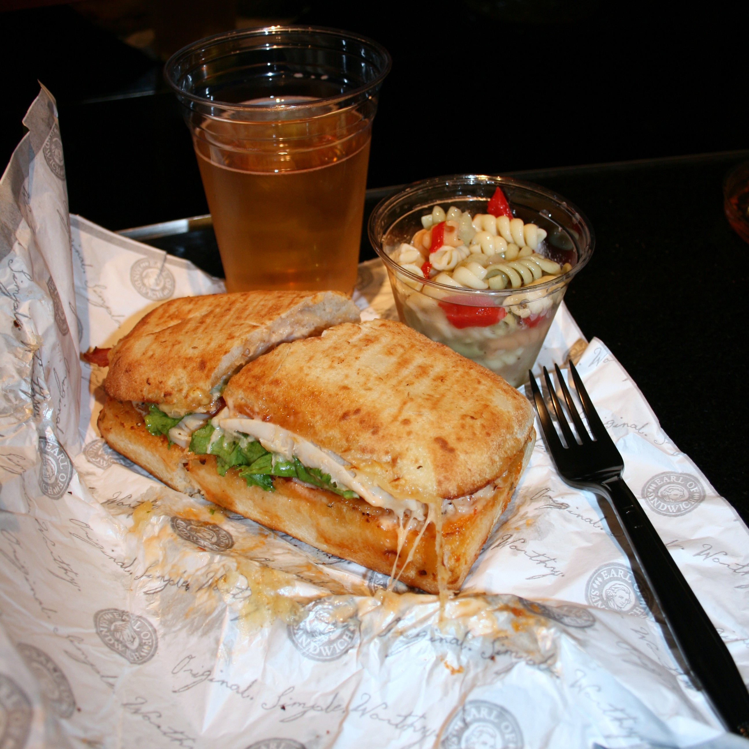 Roast Turkey Melt with Pasta Salad side and… beer!