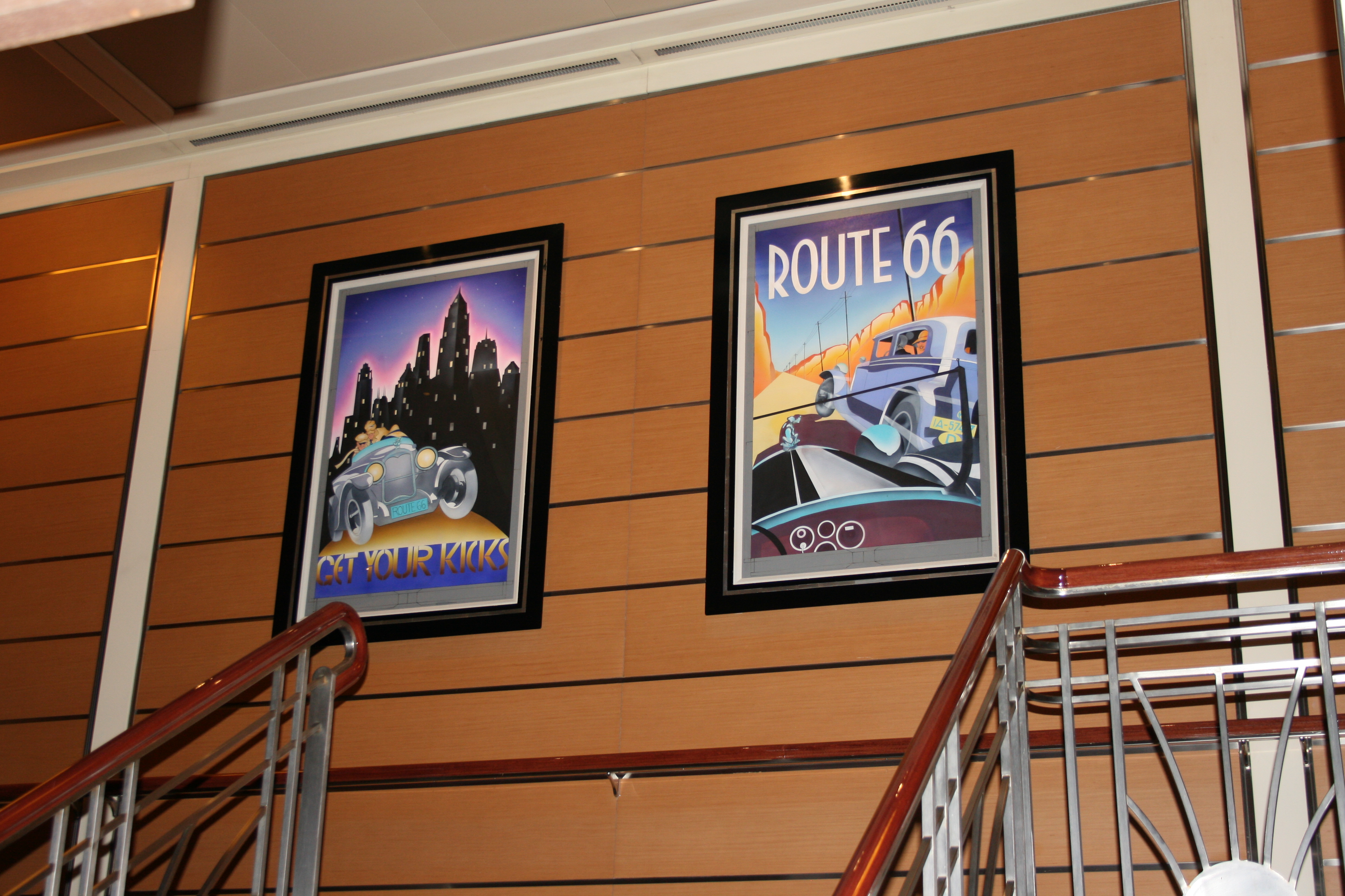 We took the Art of the Theme Show Tour and learned something about the pictures above. In each stairway, the artwork reflects the story being told on the deck it leads to or from. These pictures are from the deck which houses all of the nightclubs, presumably along Route 66.