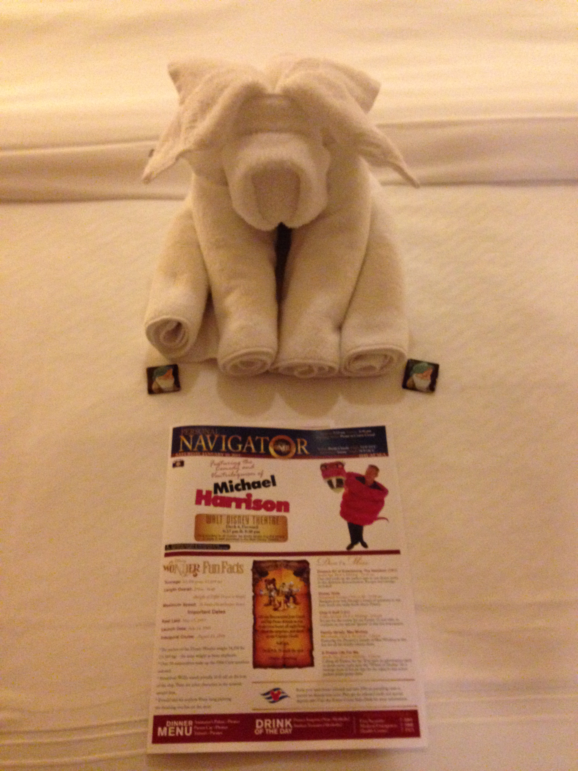 One of the main highlights of our cruise was the excellent service we received from our stateroom Host. And besides keeping our stateroom clean, he brought us our Personal Navigators each day, and a little surprise:
