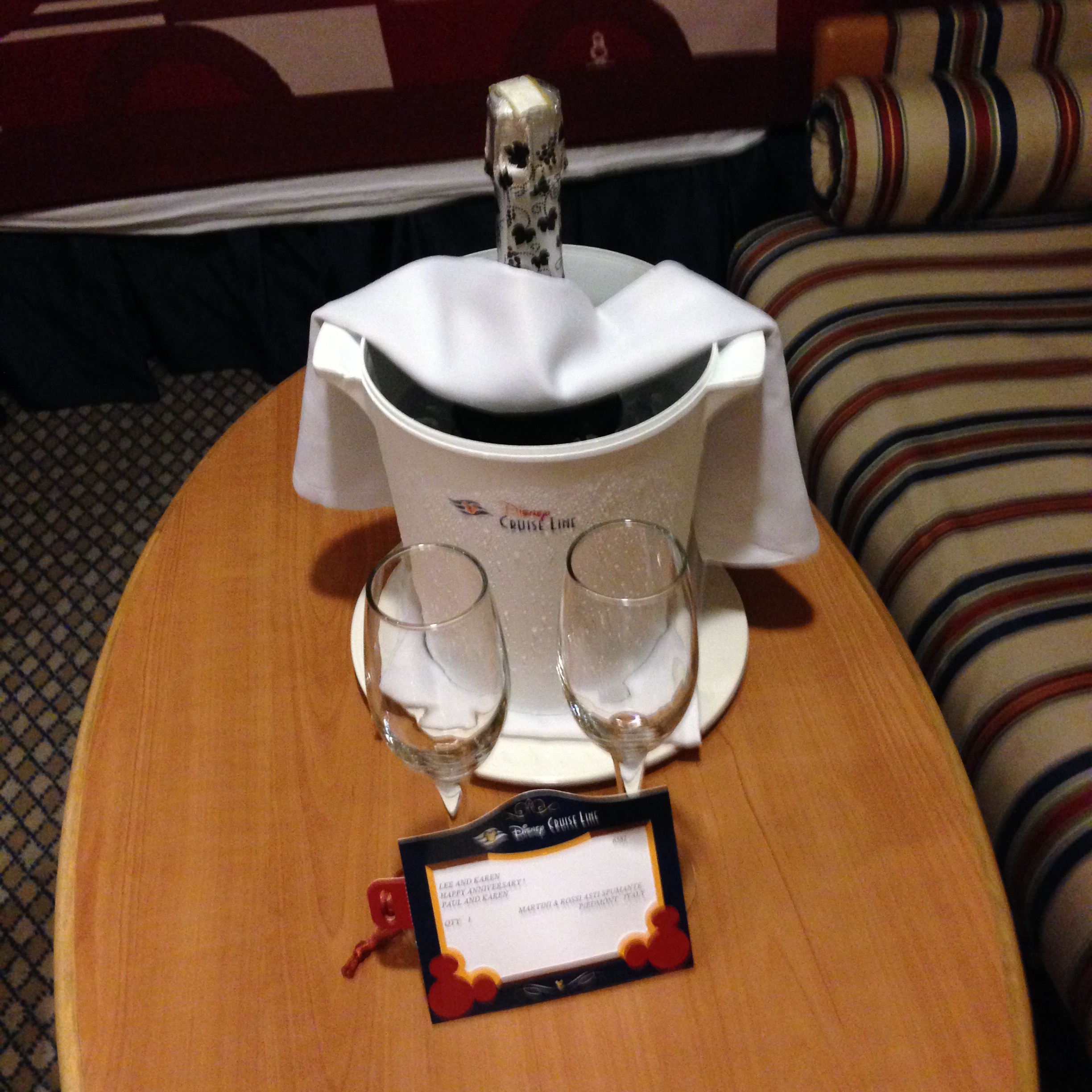 So I’ve misled you somewhat. Well, a lot what. We aren’t big alcohol drinkers, so when we found this in our stateroom upon arrival, we got excited… but not drunk. In fact, we still have this bottle of wine nine months later!