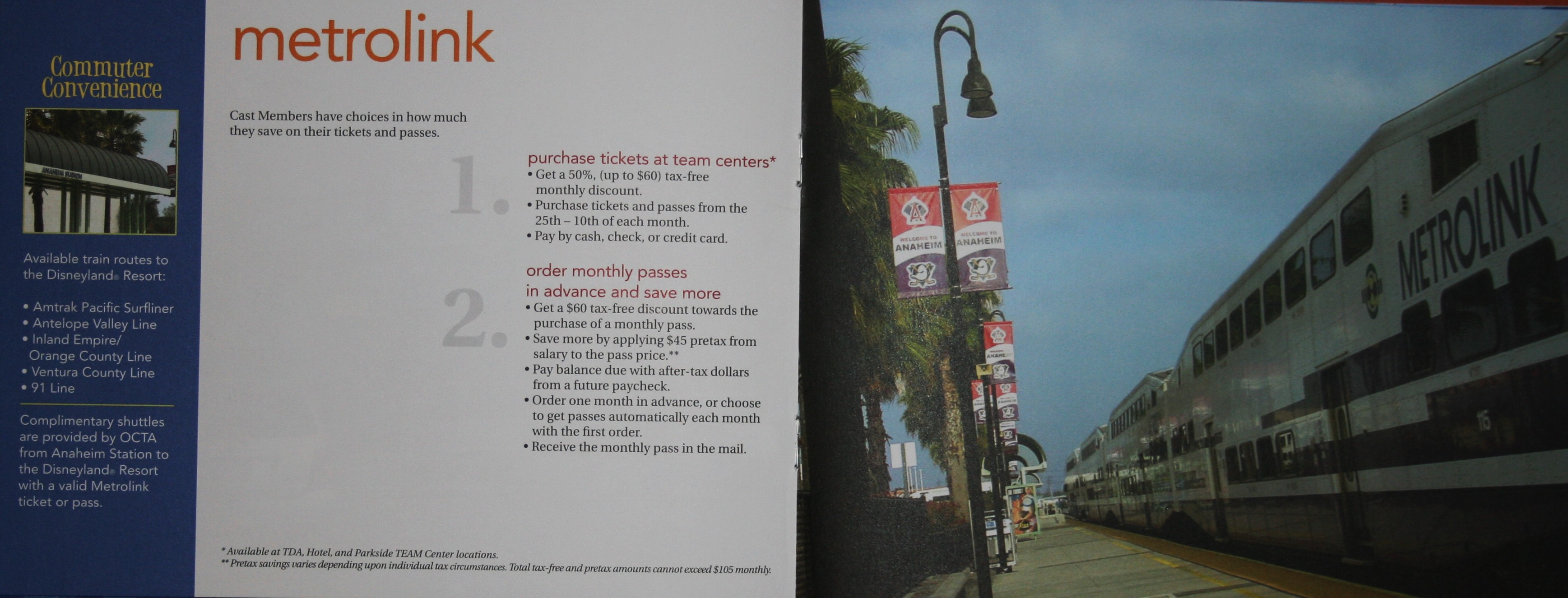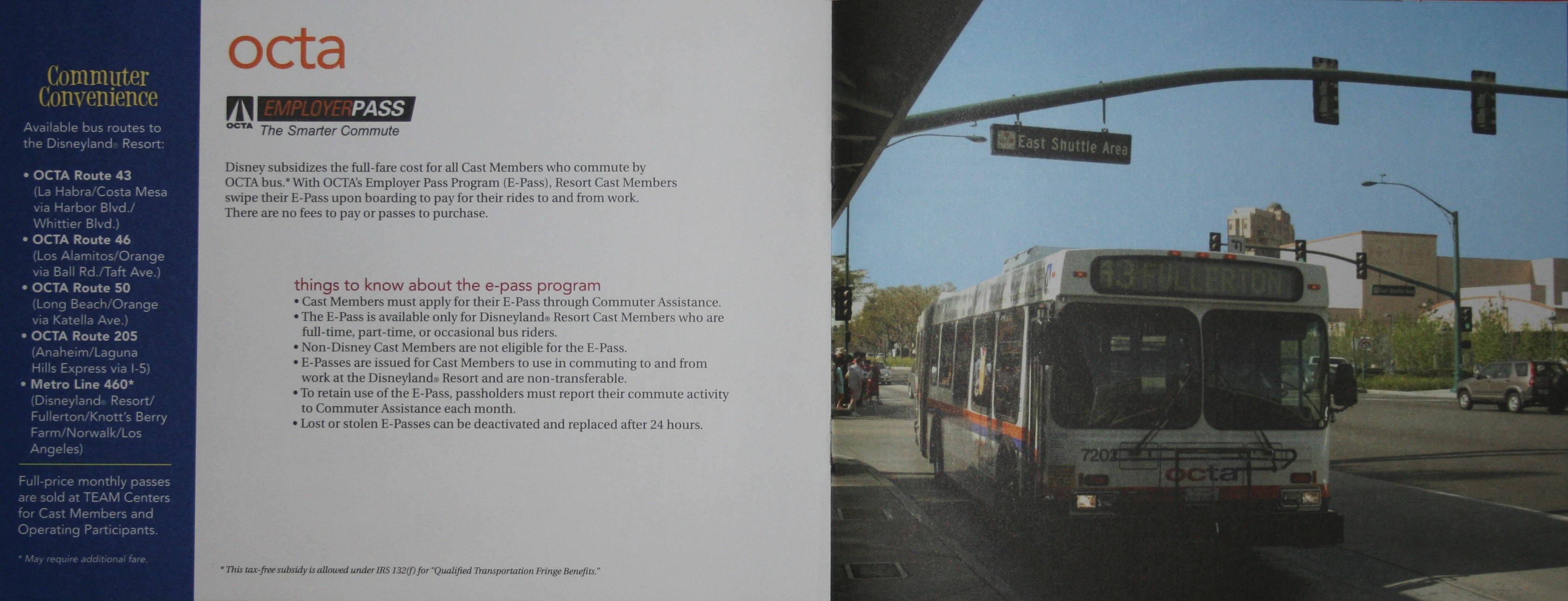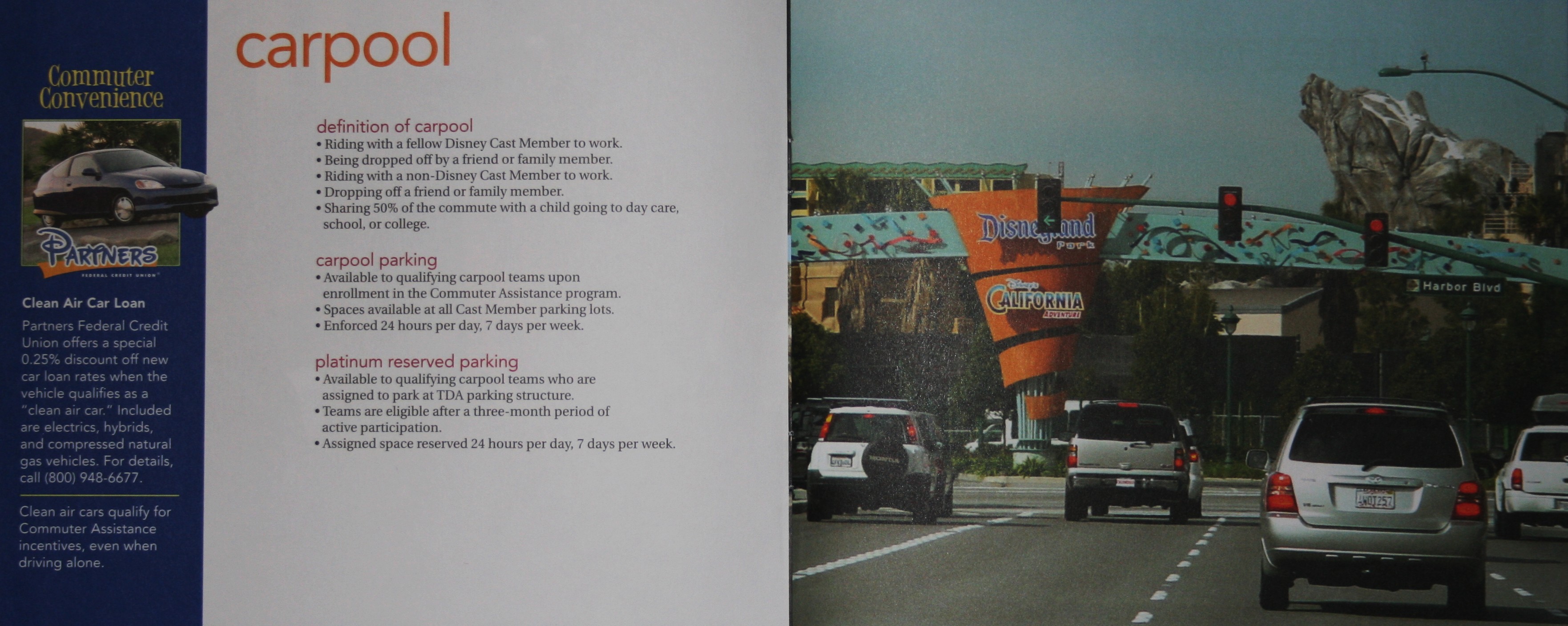 This helpful booklet is 6″ x 9 1/4″ in size and broken down into five main sections. The purpose is to encourage new (and presumably existing) Cast Members to consider the benefits and conveniences of a better commute strategy.