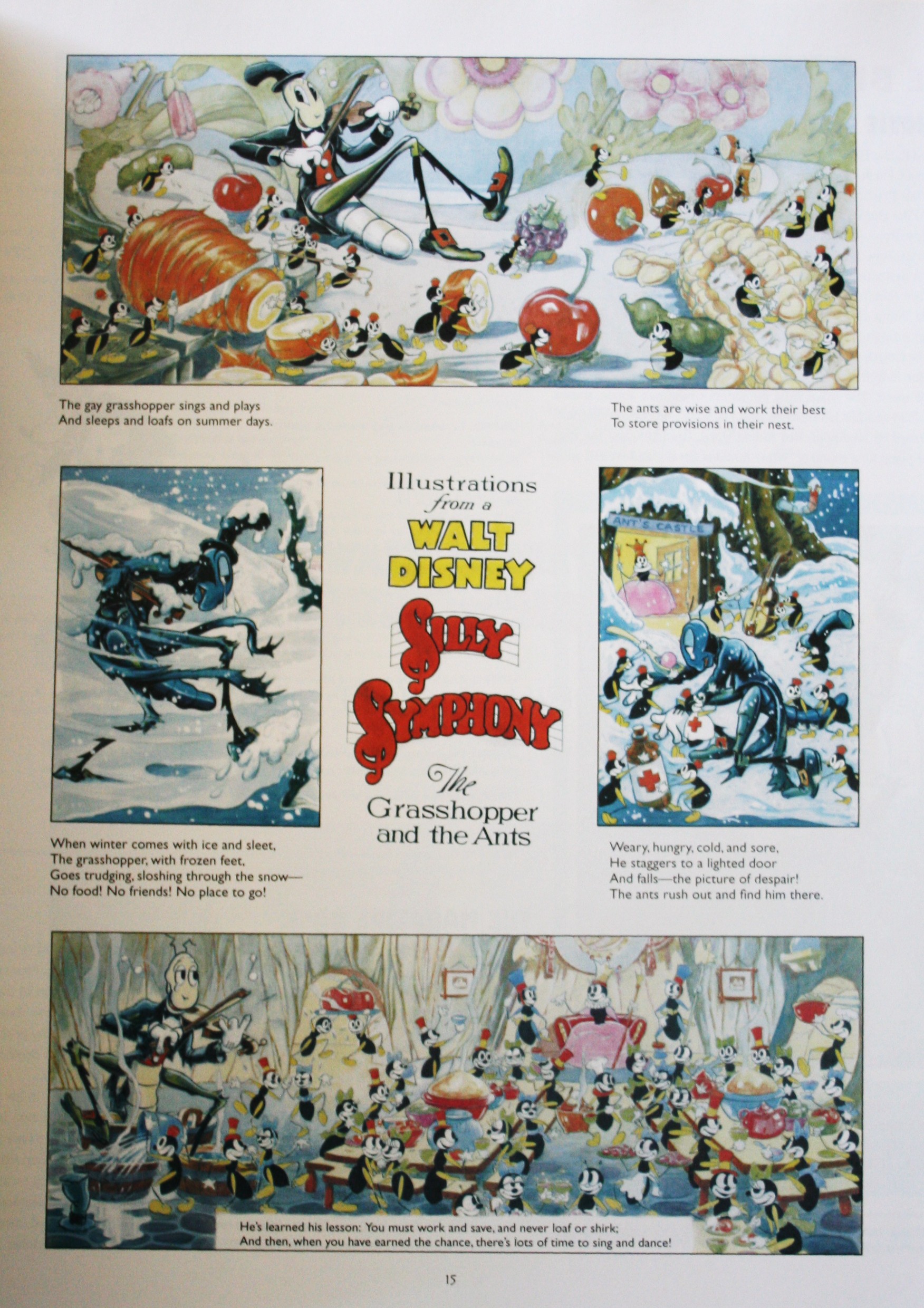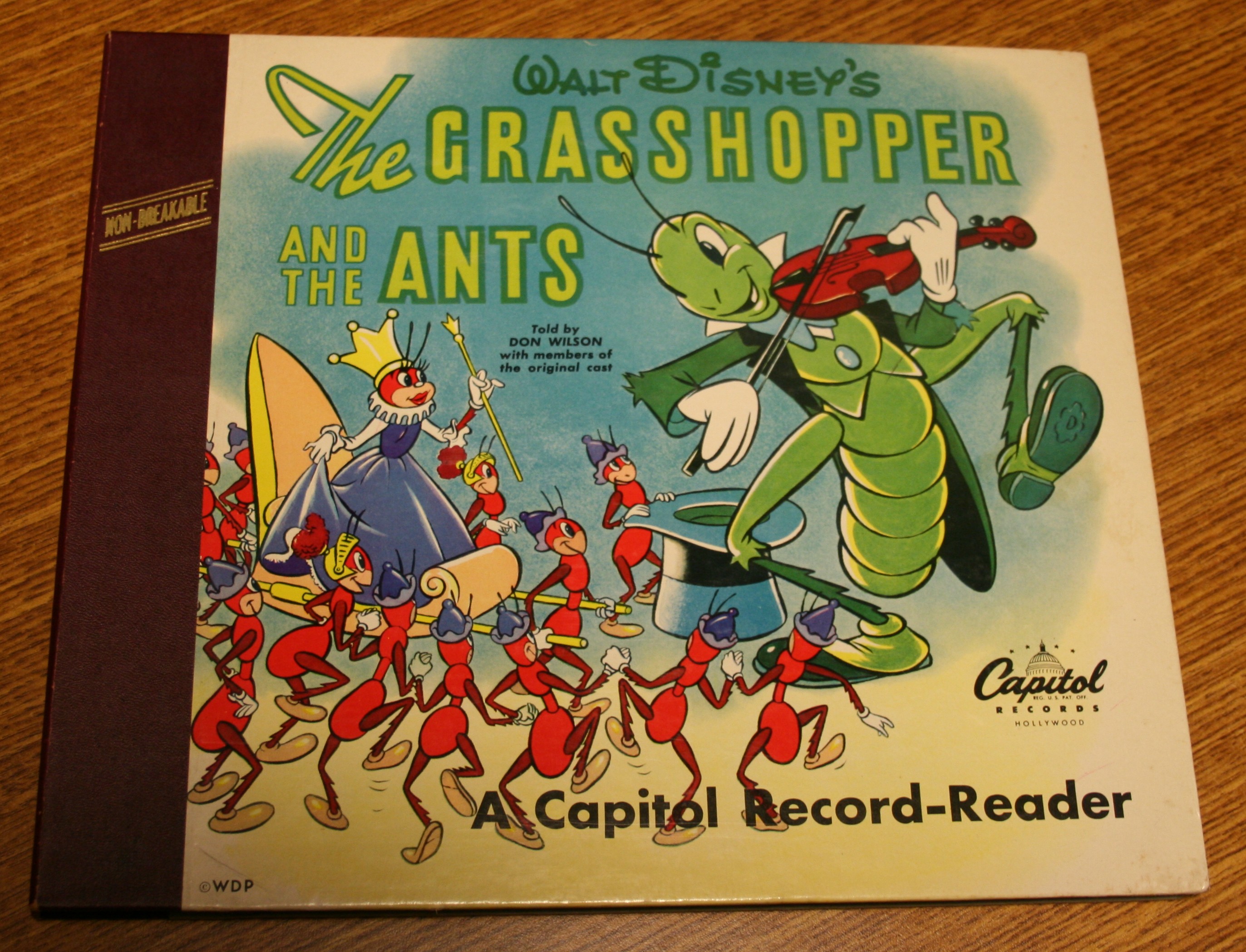 Each version of this fable is different, although all rendered by Disney animators and artists. The most detail is found in the film version, of course, but one detail is added in the record-reader: The Queen offers the Grasshopper a chance to join the ant colony and work along with them, living with them through the long winter. She does not do this in the theatrical version. He refuses, is reminded of his poor choice later, where he admits his mistake. The Good Housekeeping version strips the tale of almost all details, leaving only the basic moral in tact.