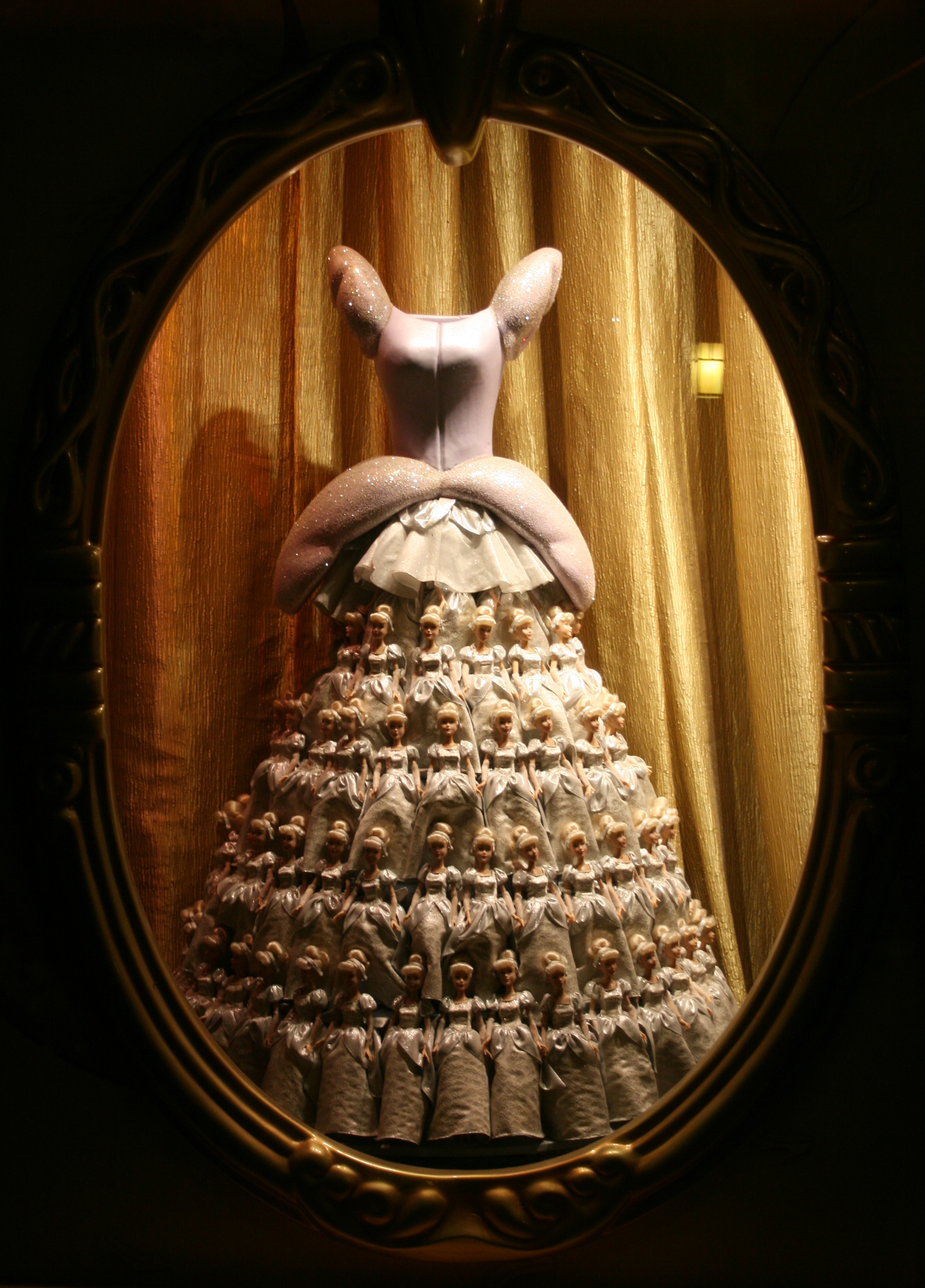 While visiting Downtown Disney (renamed Disney Springs now) I saw three Princesses posing around The World of Disney store. And in one display window, I also saw the dresses of these same three Princesses made out of dolls.