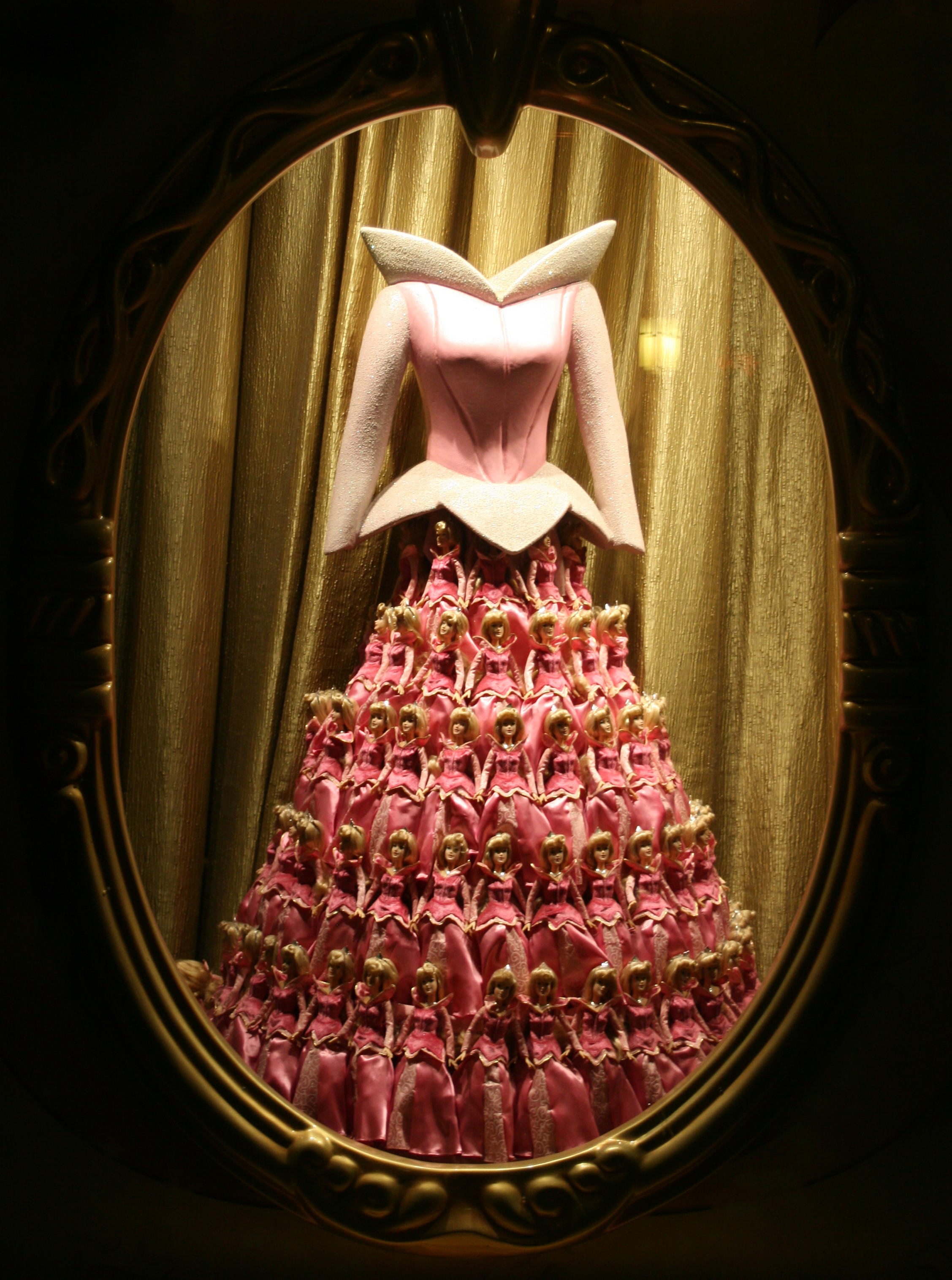 You can still pose with Cinderella and Sleeping Beauty out and around The World of Disney store, and see Belle up in the rafters inside. But I don’t think the doll-dresses are still on display. So enjoy them here! Which is your favorite?