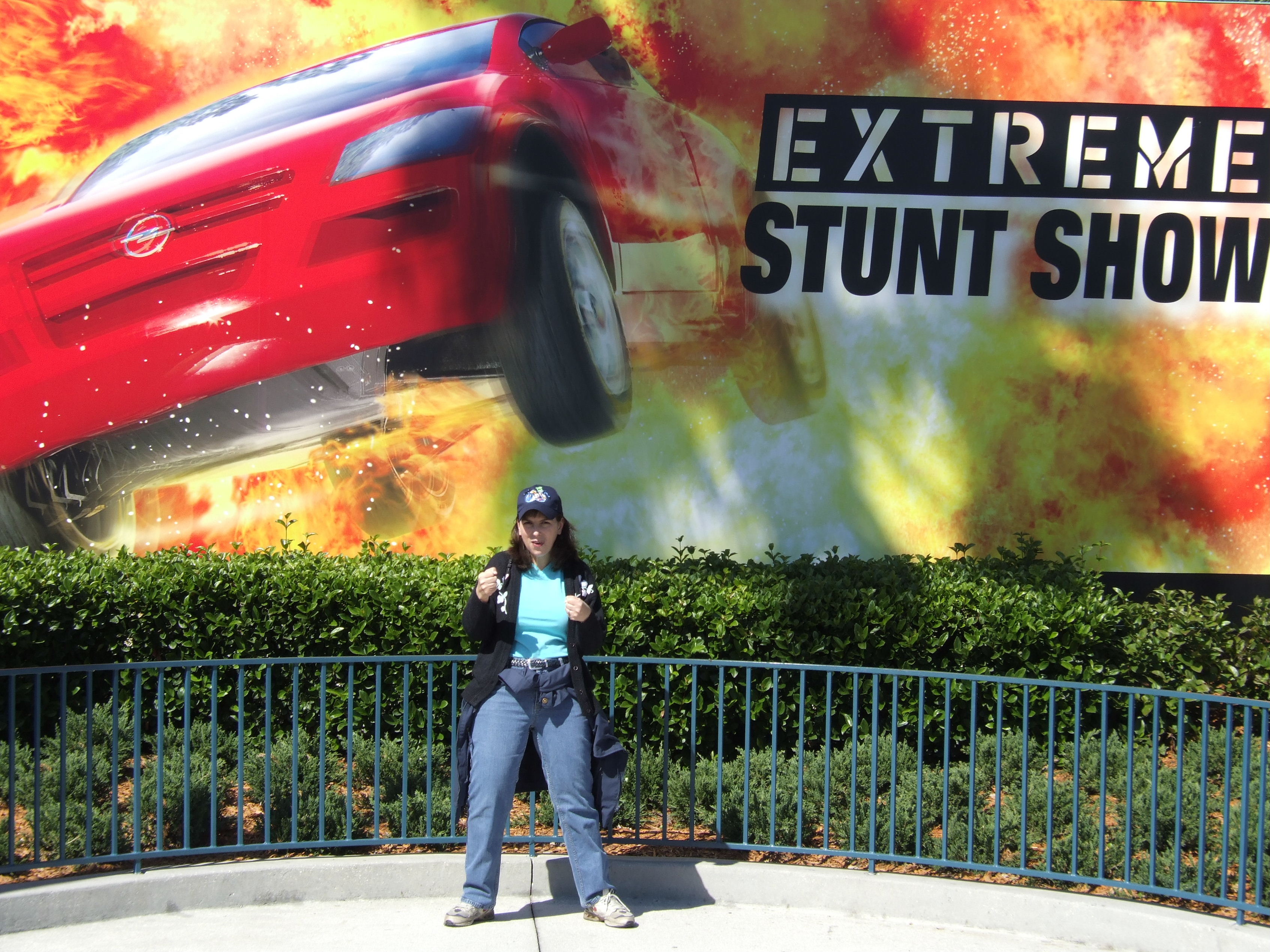 This billboard for The Extreme Stunt Show at Disney’s Hollywood Studios was very busy and dynamic. So Karen decided to try to match the level of energy in her pose by miming the positioning of a race car driver as she grips an imaginary steering wheel. The facial expression was a bonus!