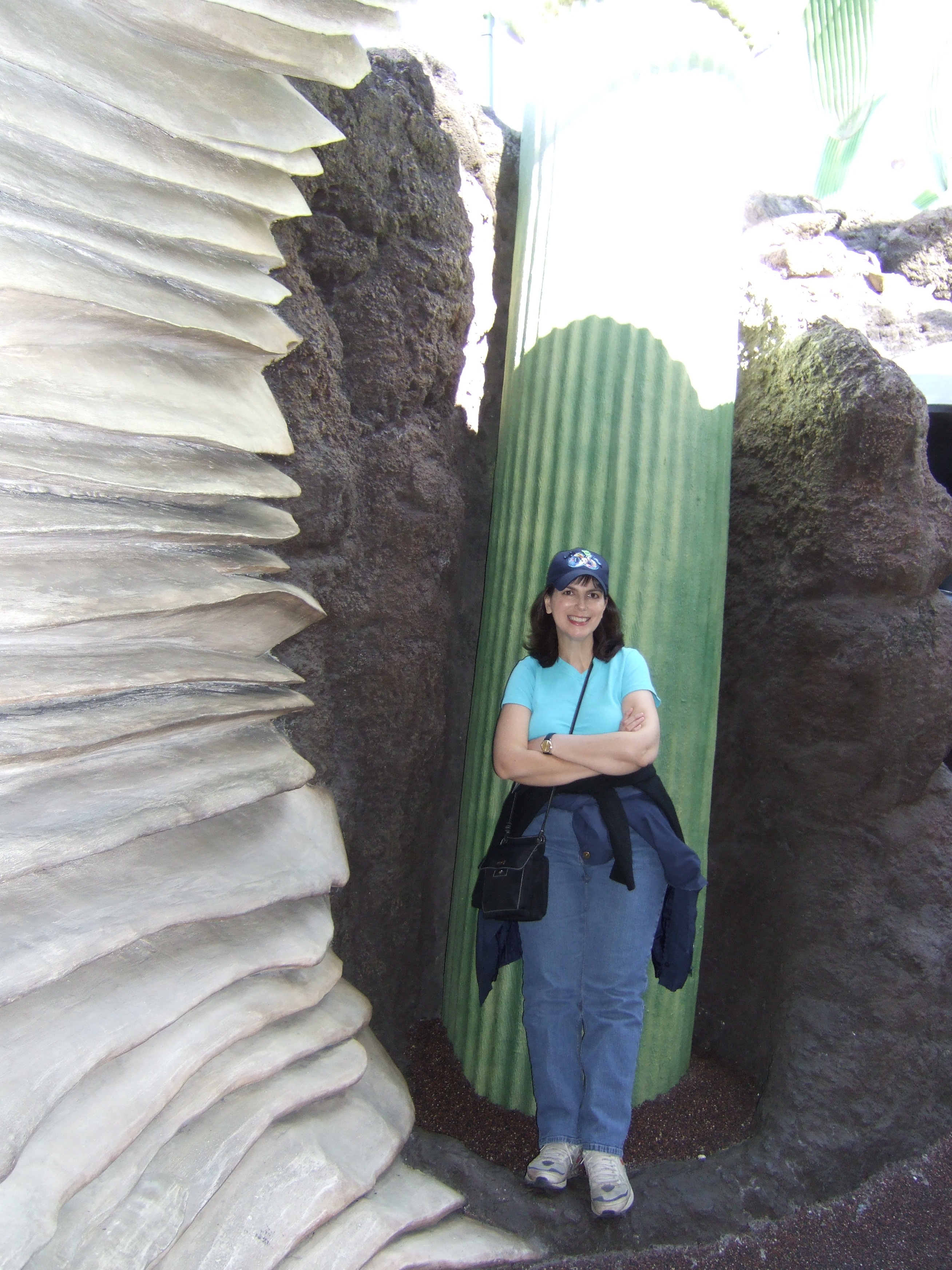 Posing in front of something isn’t very interesting, but if you can interact with the object by touching it for example, it creates a connection that can evoke a story. This topiary dinosaur outside The Universe of Energy in Epcot seems to appreciate Karen’s attention!