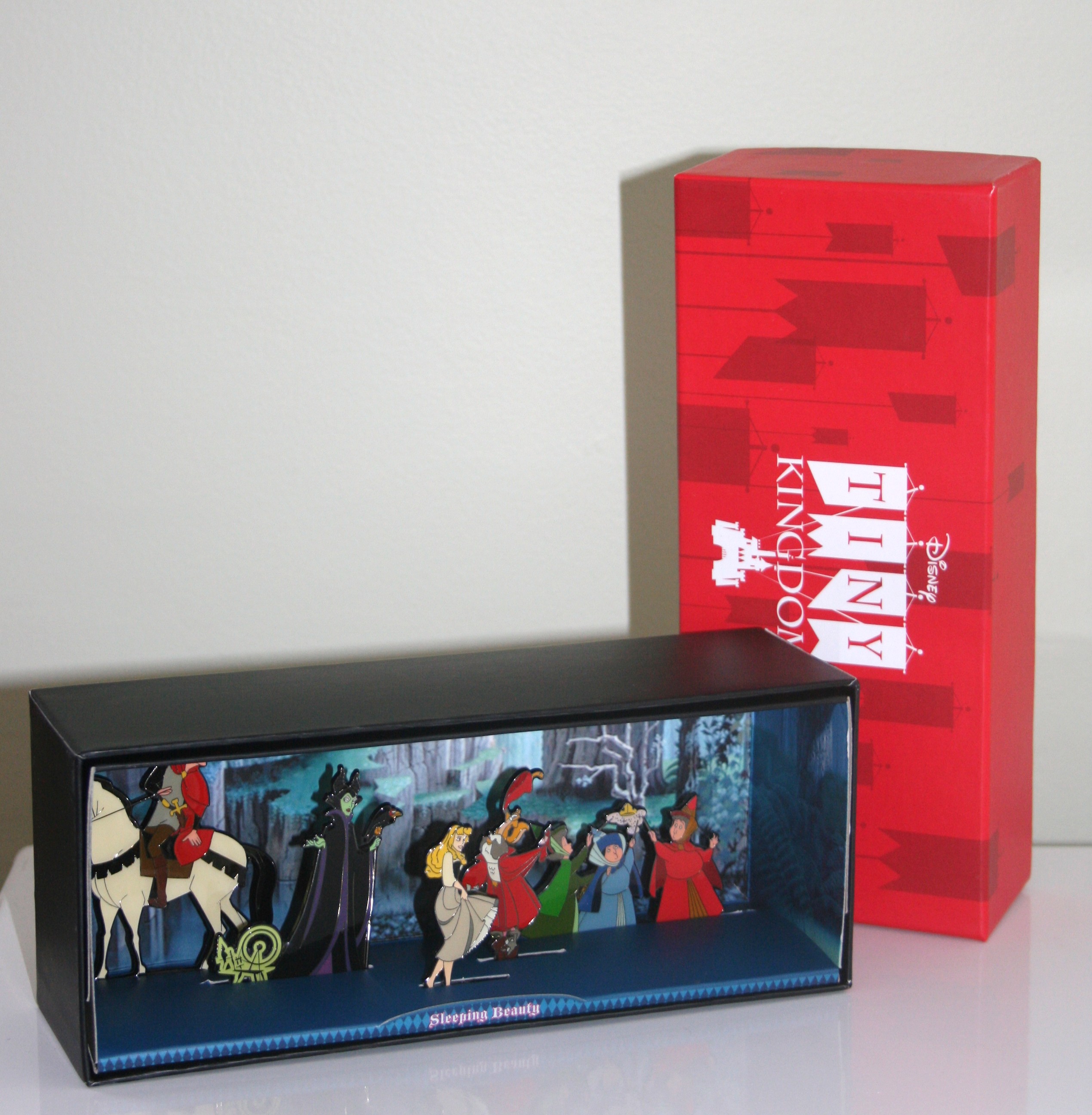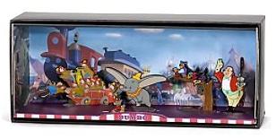 This series of miniature scenes from famous Disney films was released in 2008 featuring figurines that stood up to 2.75 inches tall in a box 2.5 inches tall by 8.25 inches wide by 3.5 inches deep (above).