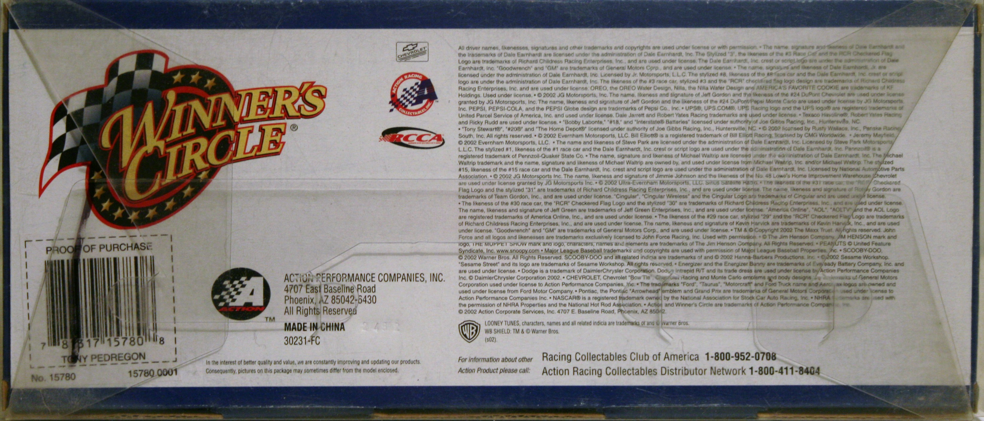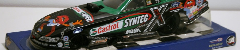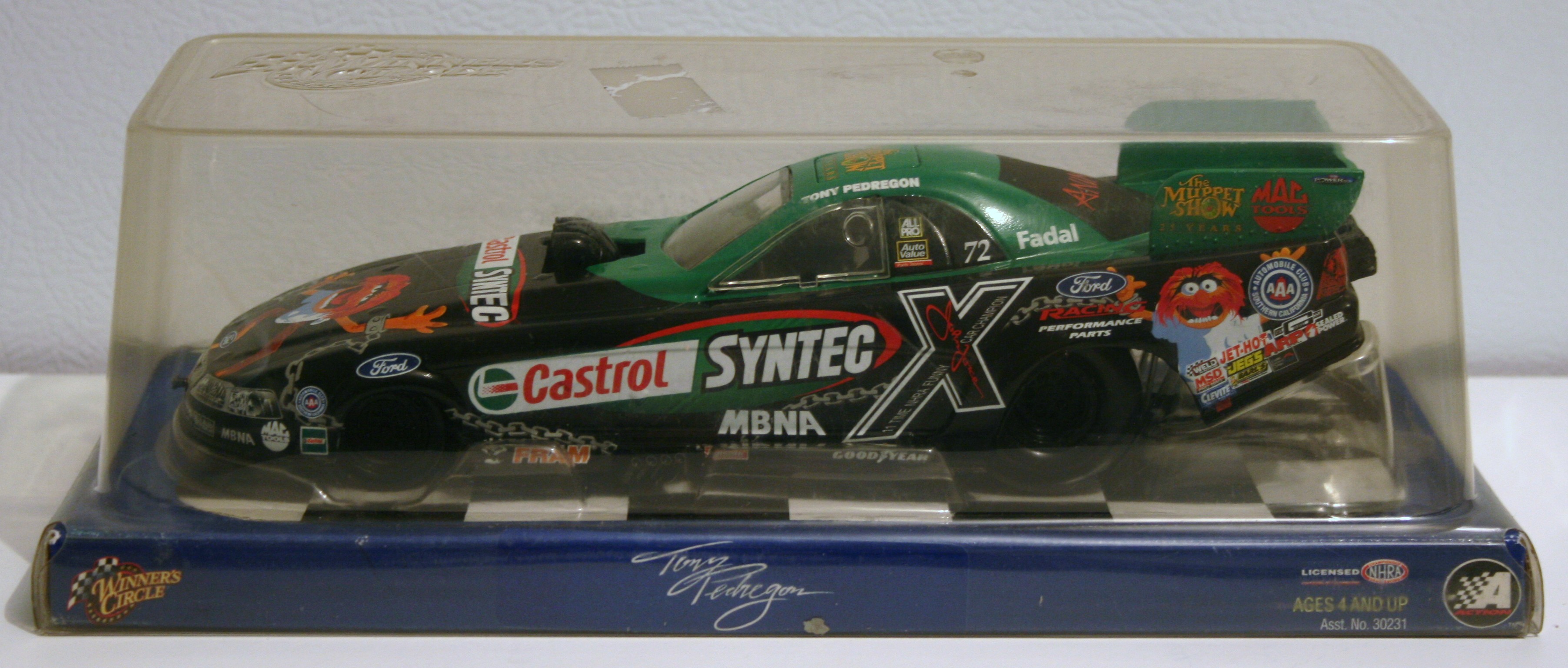 This is a die-cast funnycar model featuring Tony Pedregon (March 8, 1965) who is a 2-time NHRA Mello Yello Drag Racing Series Funny Car Champion from Torrance, California. He is also the youngest of the Pedregon brothers. His brother Cruz Pedregon is the 1992 NHRA Mello Yello Series Funny Car Champion.