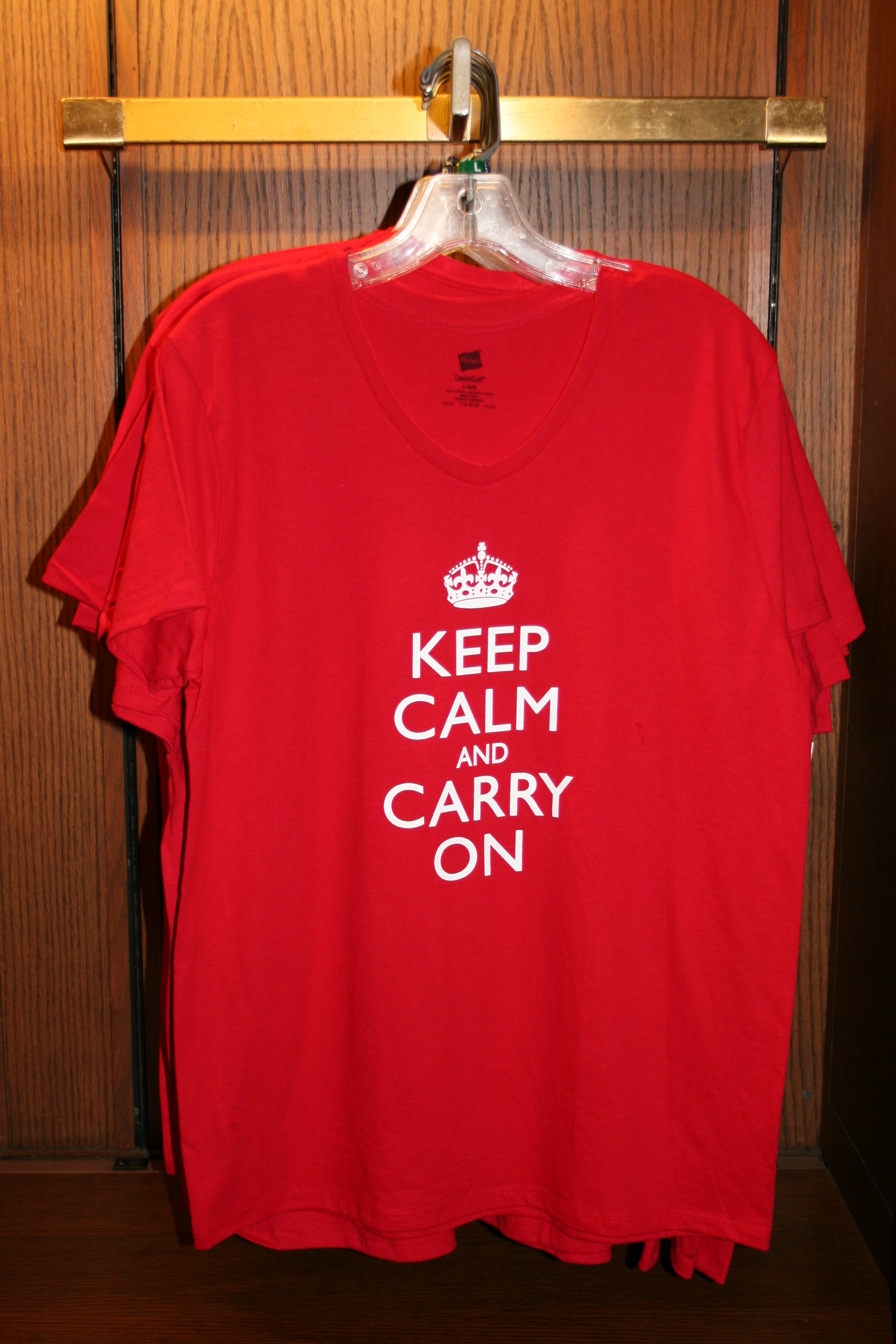 According to Wikipedia, this slogan got its start thusly: “Keep Calm and Carry On was a motivational poster produced by the British government in 1939 in preparation for the Second World War. The poster was intended to raise the morale of the British public, threatened with widely predicted mass air attacks on major cities. Although 2.45 million copies were printed, and although the Blitz did in fact take place, the poster was hardly ever publicly displayed and was little known until a copy was rediscovered in 2000 at Barter Books, a bookshop in Alnwick. It has since been re-issued by a number of private companies, and has been used as the decorative theme for a range of products.“
