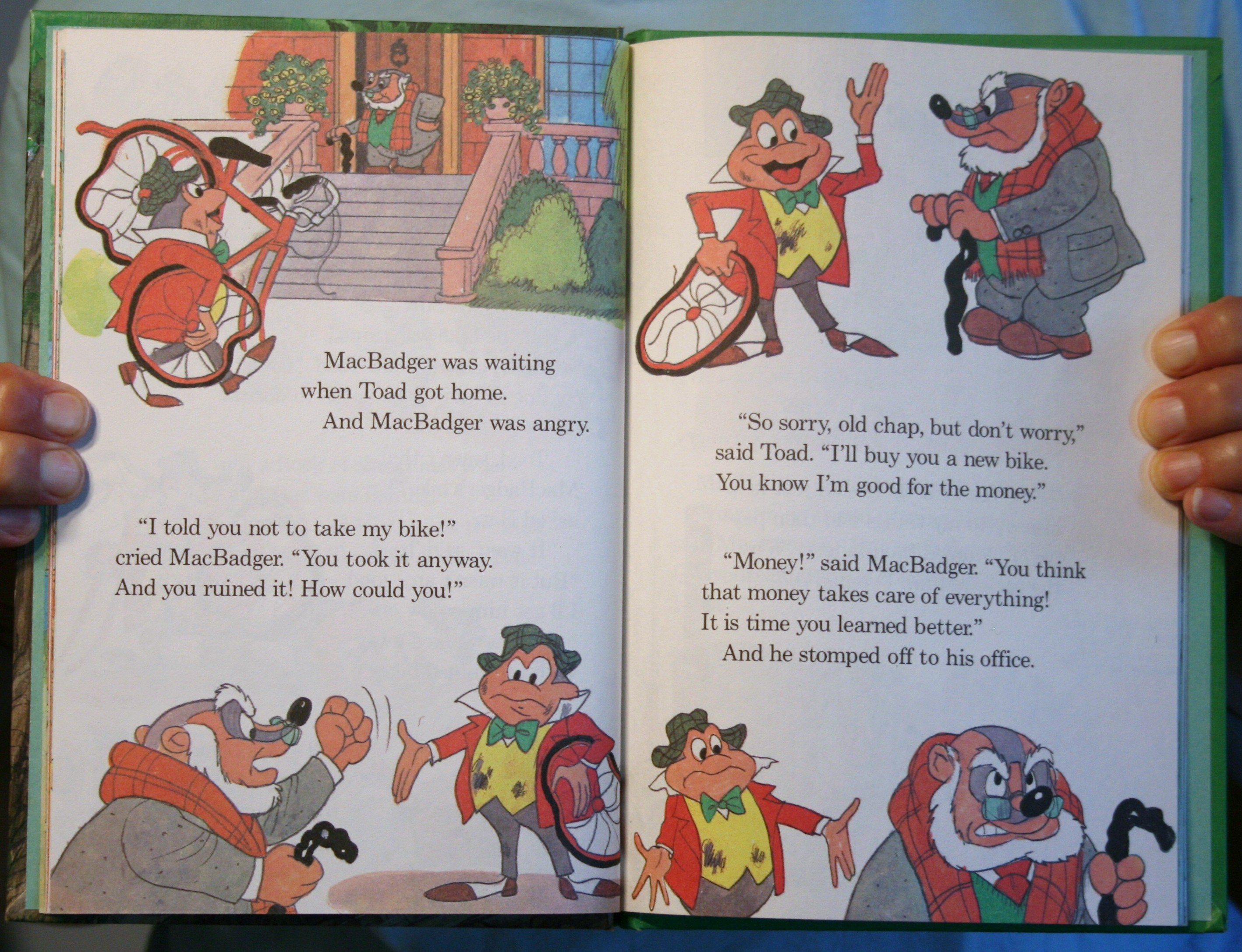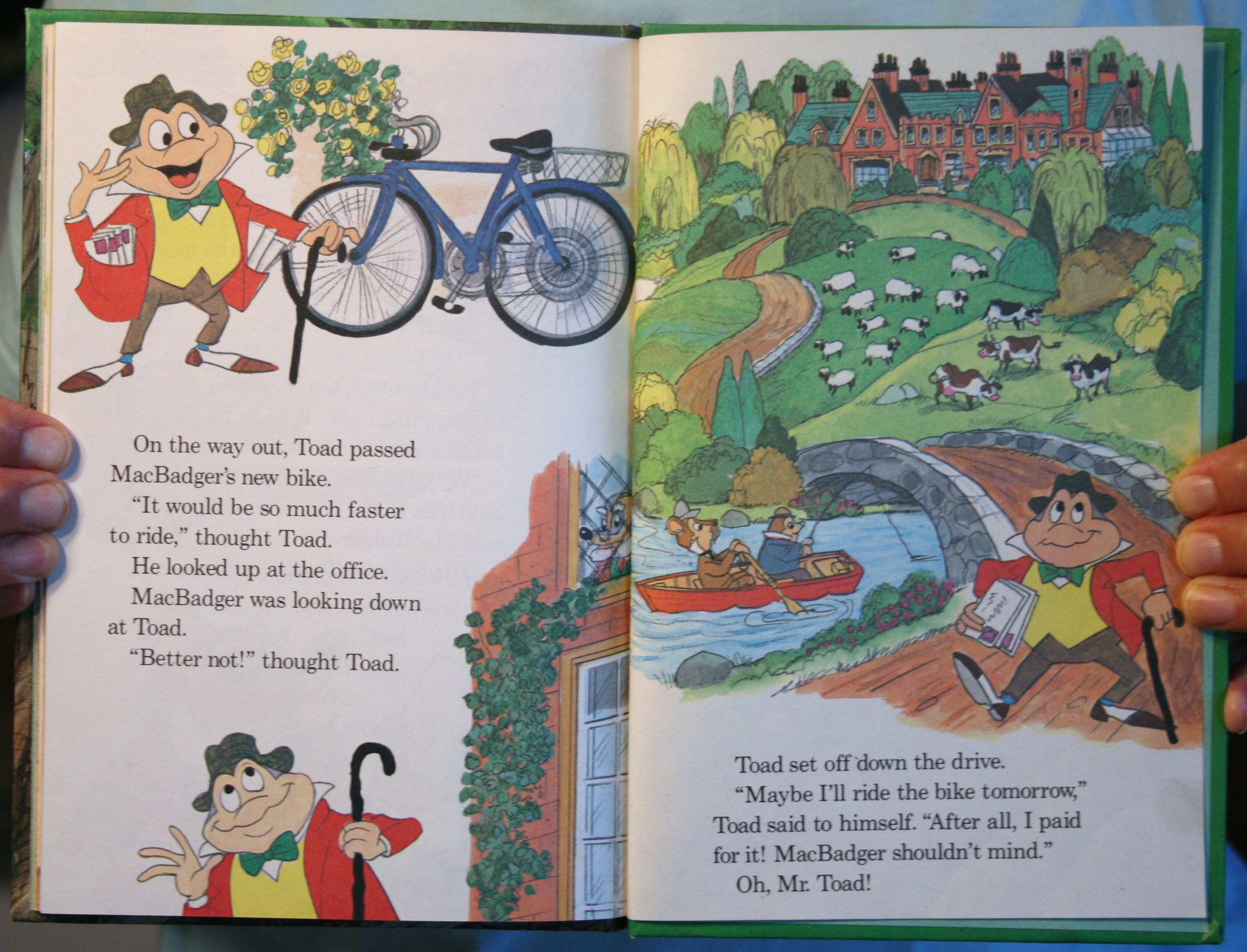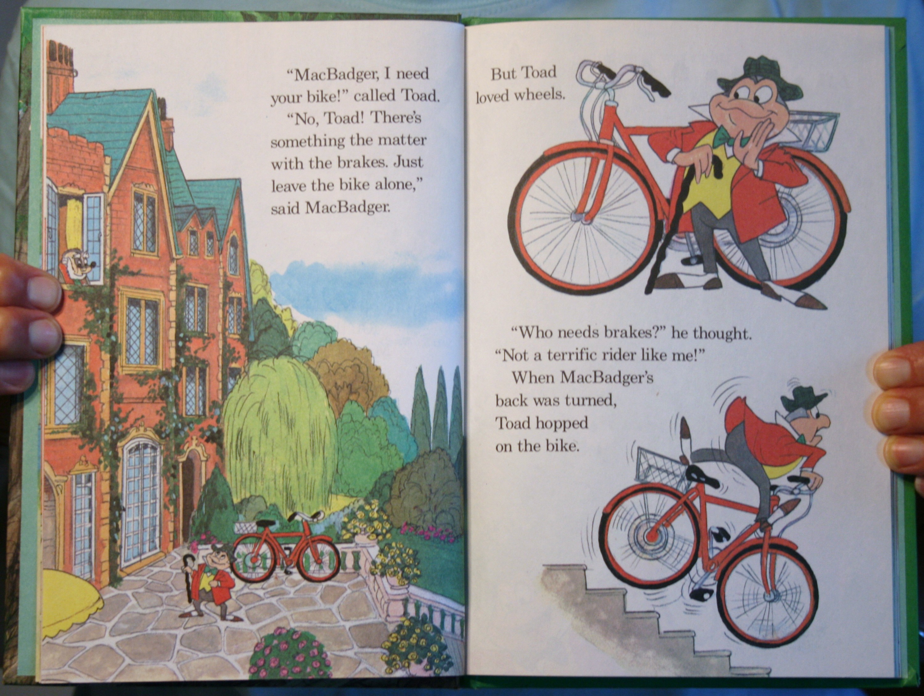Even though Mr. Toad is warned that MacBadger’s bike has no brakes, he just can’t resist the call of the open road…