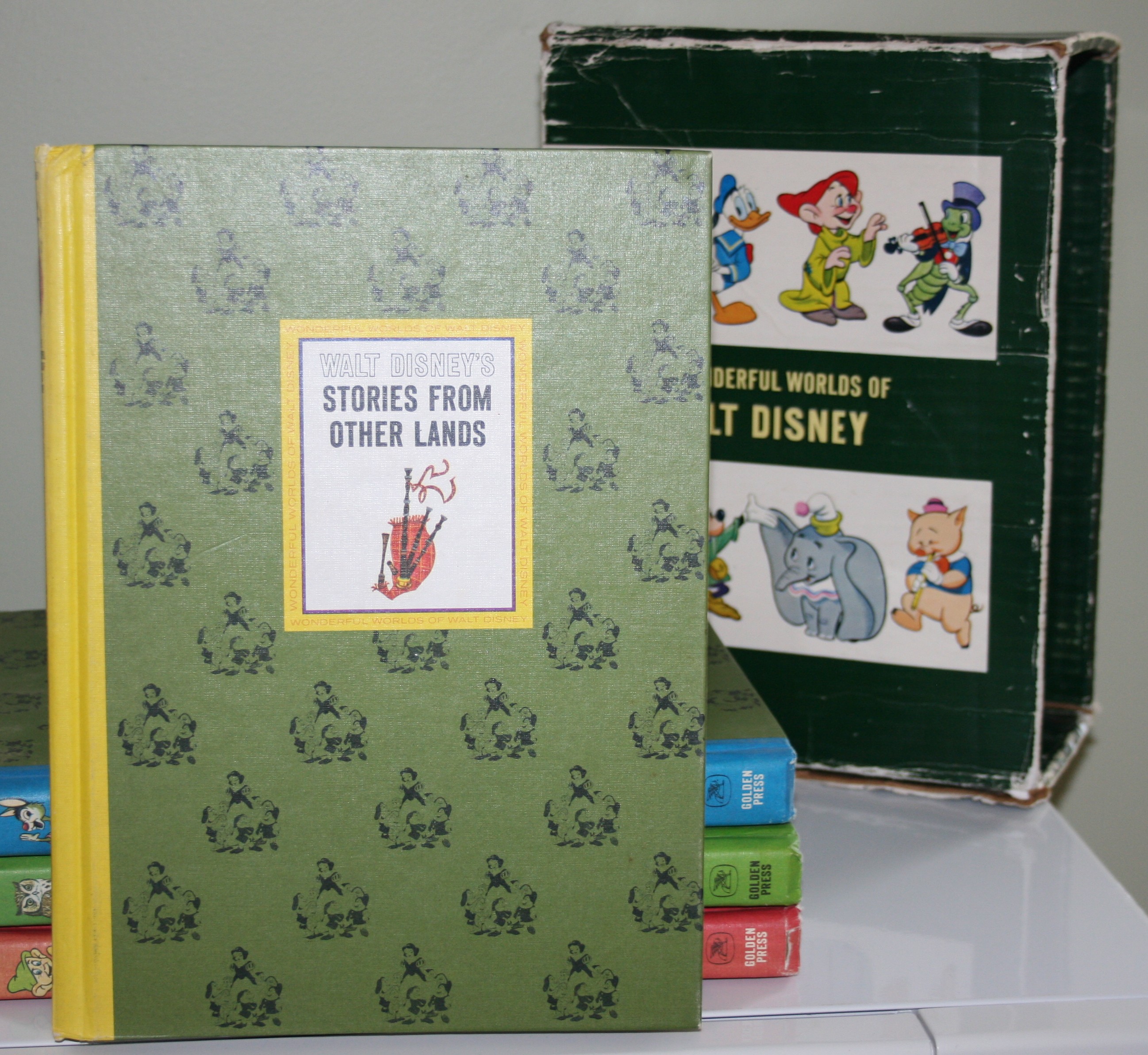 Once again the idle thought to stop at a yard sale has yielded yet another great addition to my growing Disney book collection. This time I’ve found a beautiful set of four hardcover volumes from 1965. Complete and with the original cover sleeve no less! This is especially precious to me as that is the year I was born and I love finding things from my birth date.