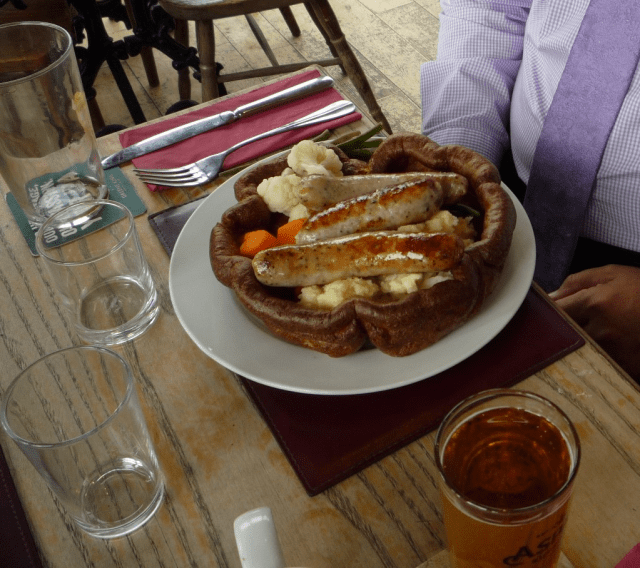 Three huge locally-made spicy sausages, mashed potatoes, carrots, cauliflower, all swimming in gravy, served in a Yorkshire pudding bowl! I washed it down with a pint of Bitter. And if you’re wondering: Yes. I finished every last bit of it!
