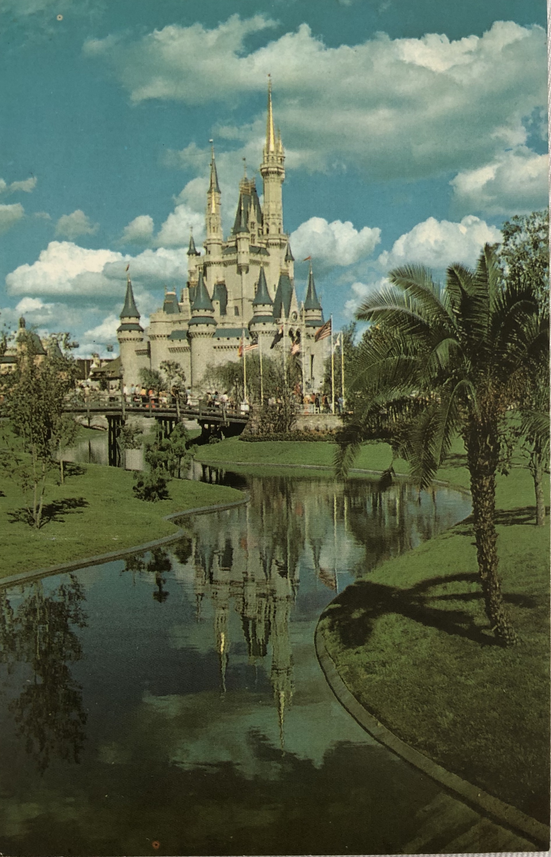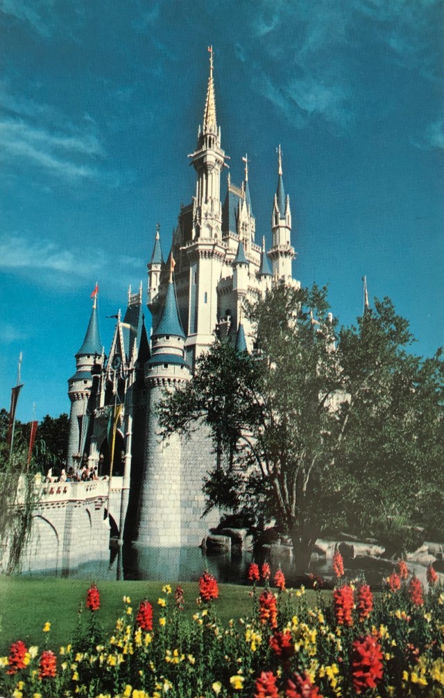 From the back of the card: “Cinderella Castle provides a spectacular backdrop for Mickey Mouse and a cast of thousands on the world’s largest, most exciting stage… Walt Disney World.”