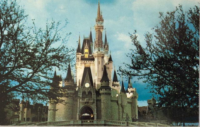 From the back of the card: “Glowing warmly at twilight, Cinderella Castle towers 18 stories above the “happiest land of them all”… Fantasyland. High inside the castle, guests dine in royal splendor in King Stefan’s Banquet Hall.”