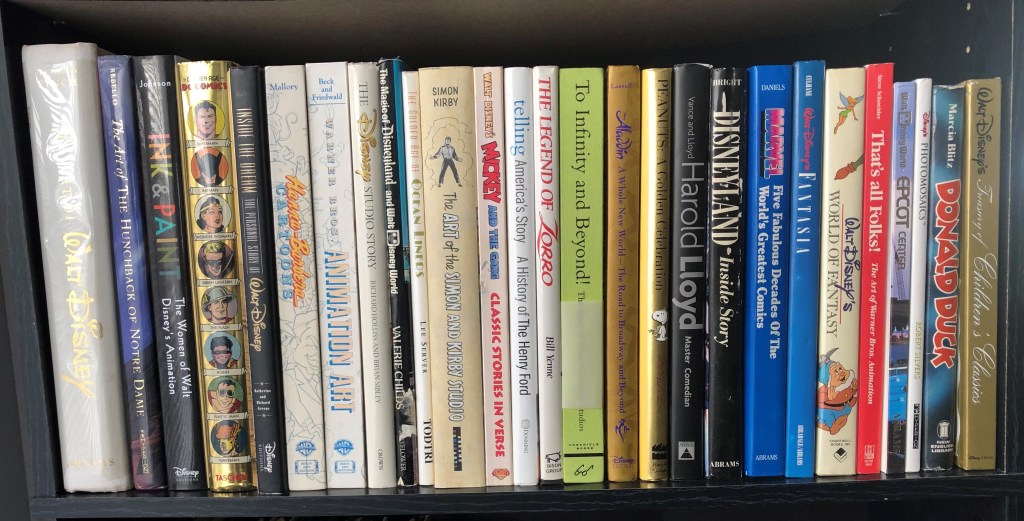 Third Shelf: ‘Ink and Paint – The Women of Walt Disney’s Animation’ is a lavishly illustrated and very comprehensive read about an underrated group of contributors to the world of our favorite Disney characters. ‘The Art of the Simon and Kirby Studio’ shares the history of two of comic books greatest actual heroes with some amazing never-before-seen artwork. This is only one of the many books I have on the history of Marvel and DC comics. ‘Harold Lloyd’ harkens back to the Silent Screen where men like Buster Keaton and Charlie Chaplin risked life and limb to make us laugh. But somewhat before and contemporary with those two more well-known men was another man who perhaps went them one better! Lastly on this shelf is ‘Donald Duck’. Need I say more?