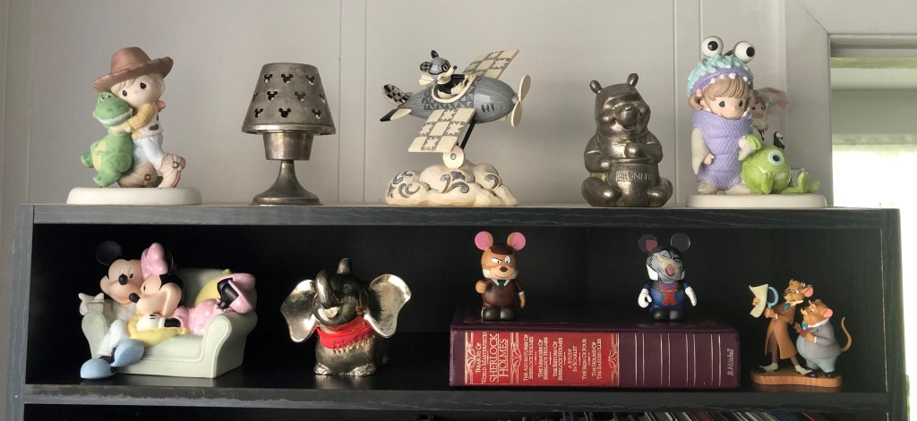 I thought I would adorn this bookshelf with some collectibles of another sort to prove it’s not all about the books. Mostly. But not all. Notice my leather-bound edition of the complete Sherlock Holmes stories? Whom do you see standing upon it and beside it?