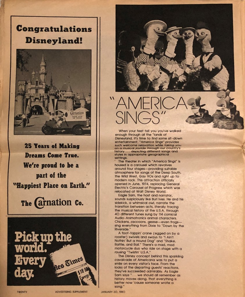 We start this page with more plugs for Disneyland partners such as The Carnation Co. And dig that beautiful Carnation van! The Los Angeles Times takes a moment to fill some space for itself. Then we are treated to a little article about America Sings. We’re told that if our feet are tired of walking the lands of Disneyland it may be ‘time to find some sit-down entertainment.’ 40 songs are sung by 114 comical Audio-Animatronic animal characters such as chickens, raccoons, geese, and even frogs!