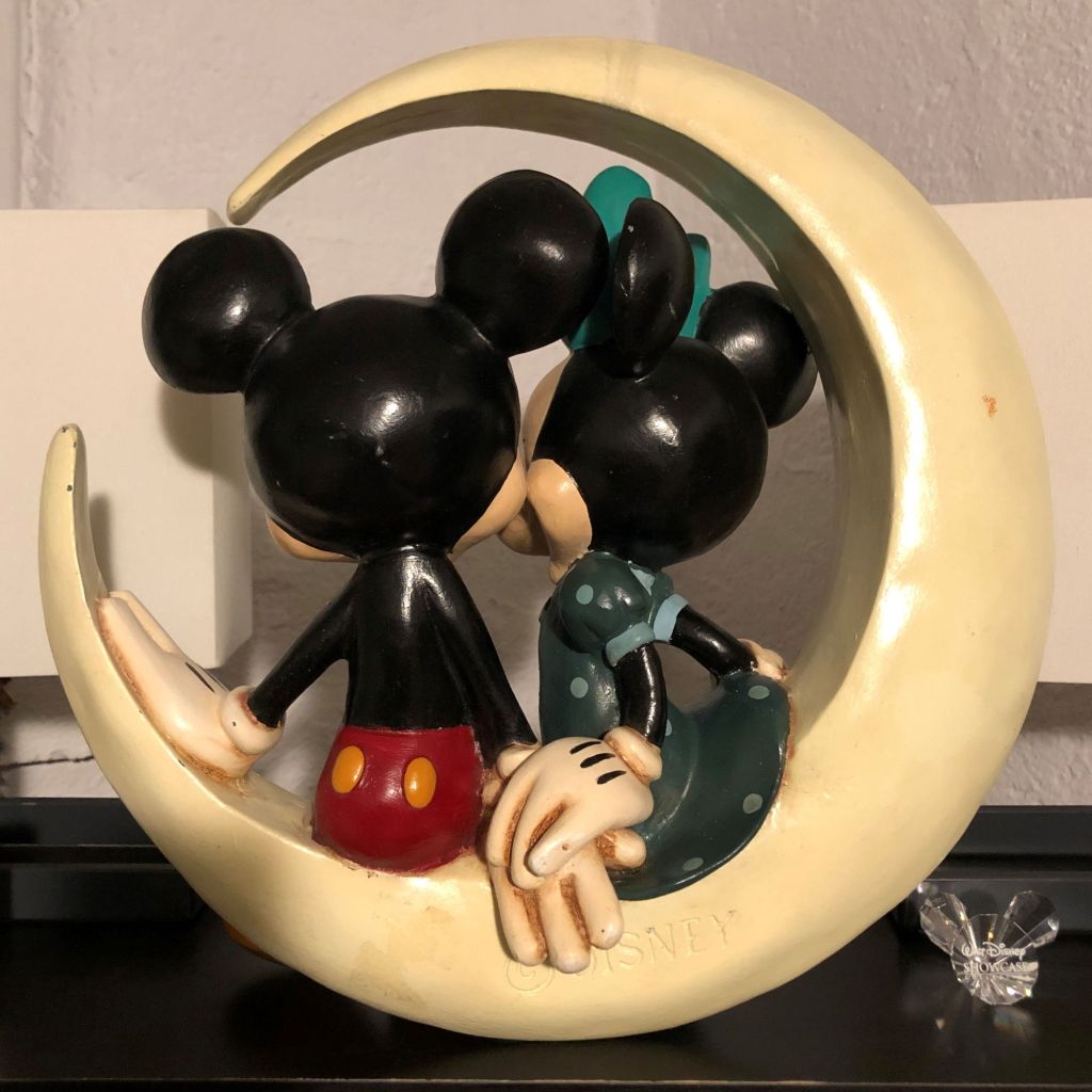 This wonderful piece stands about 16″ tall and features Mickey and Minnie spooning on the moon! How cute is that? It was produced as part of the Mickey & Co. line of merchandise and isn’t as old as it looks. Each piece was hand crafted to appear antique, so the patina and ‘damage’ is intentional.