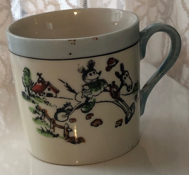 Sometimes children get the best stuff to play with! This cup is part of a complete set of dining ware made for small children to have tea parties with. Sets could have up to 15 pieces consisting of cups, plates, tea pot, milk and sugar bowls. Many vintage Disney tea sets feature Mickey Mouse doing things like sweeping the floor, rowing in a boat with Minnie, or even riding Horace Horsecollar: