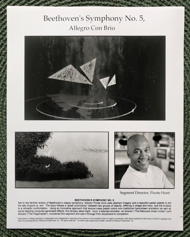 What I can show you is the Promotion Cards. Each has the name of the musical piece featured, images from the segment, a picture of the Segment Director, and a brief synopsis. At first I wondered why the images weren’t in color until I realized that they were intended for reproduction in black and white newspapers.