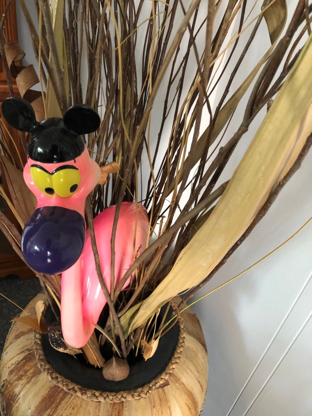 Mr. Flamingo has never been outside so he still looks as fresh and clean as the day he ventured out of his box. He enjoys wading in the ‘weeds’ of our indoor planter!