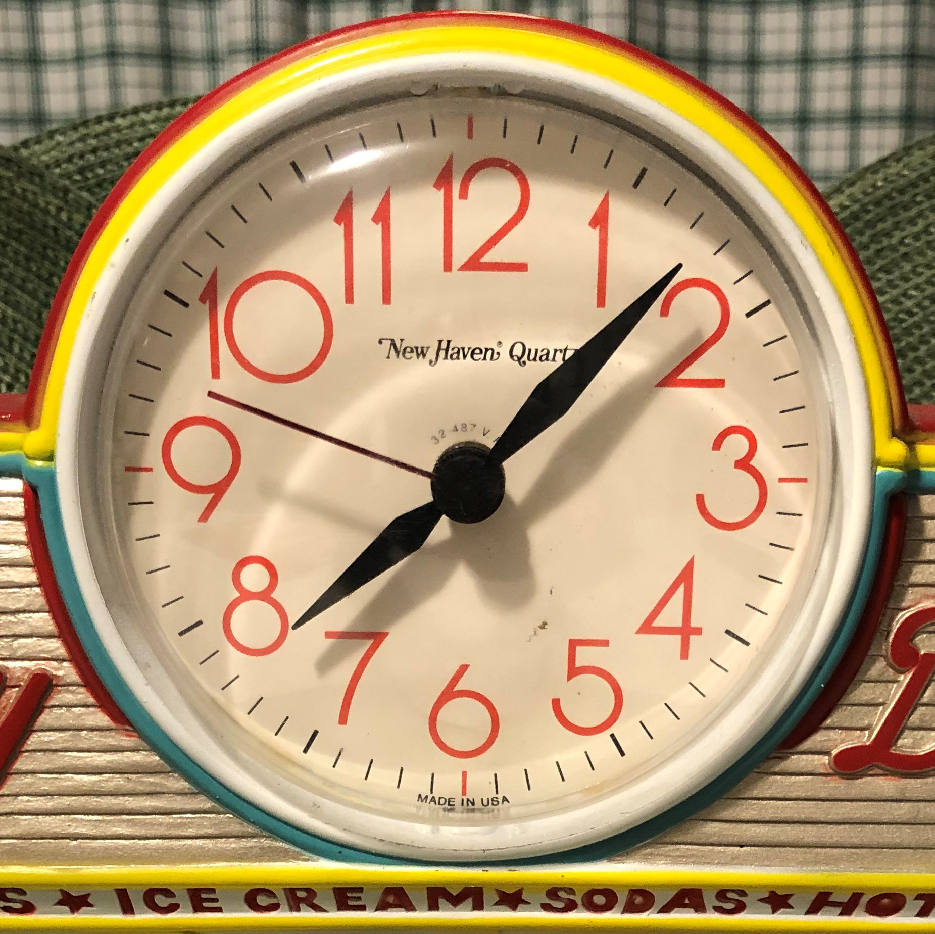 This diner clock is powered by a AA battery and also has a convenient hook for hanging.