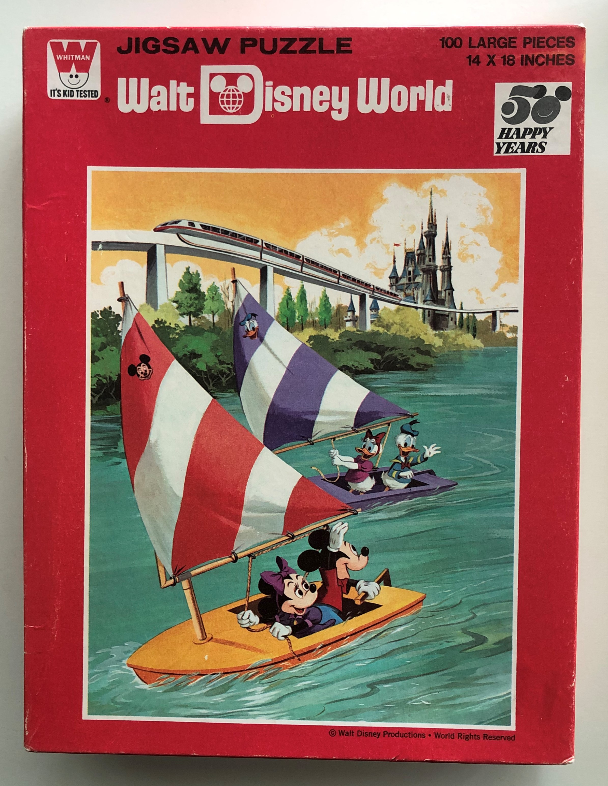 Unlike most depictions of Walt Disney World on products like this, this one accurately portrays the location and activity as it would be experienced by any guest. It captures Mickey, Minnie, Donald, and Daisy enjoying a friendly sail on Bay Lake with the monorail and Cinderella’s Castle in the background. Pure vintage gold!