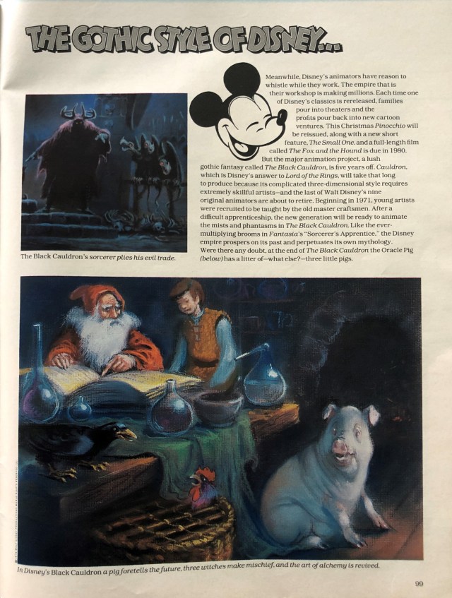 Next we touch on what Disney is planning on to compete in this new tone for animation with some concept art from the Black Cauldron, still five years off at the time of the writing. We know now just how much this film missed the mark for Disney!