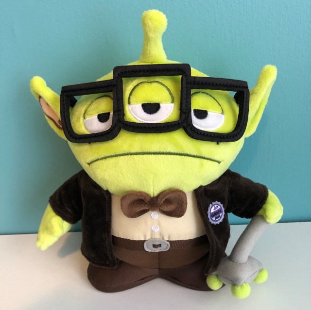 Carl Fredricksen did learn to crack a smile towards the end of the film, UP, but it took a bit of work! A nice touch with this plush is the inclusion of the grape soda badge given to him by little Ellie. And I want one of those four-point canes with tennis balls when I get old! And did you notice the hearing aid?