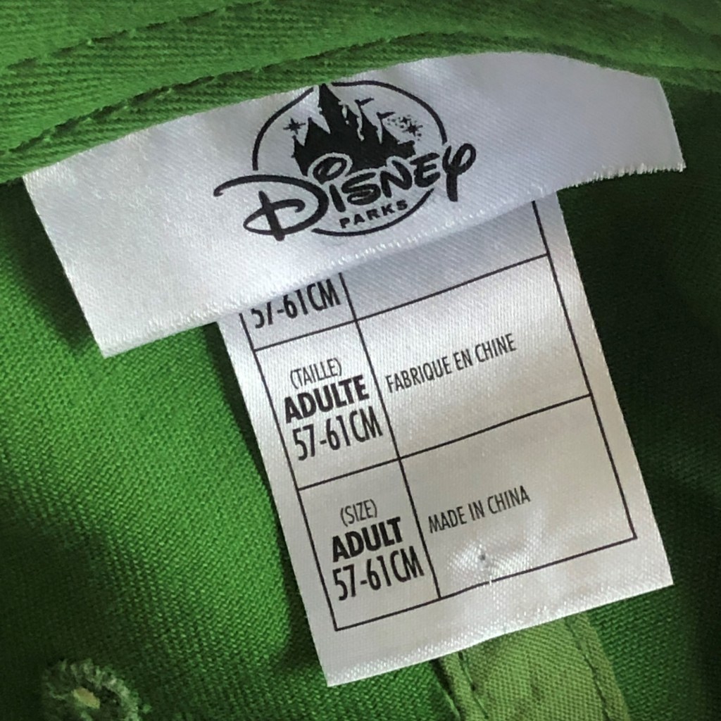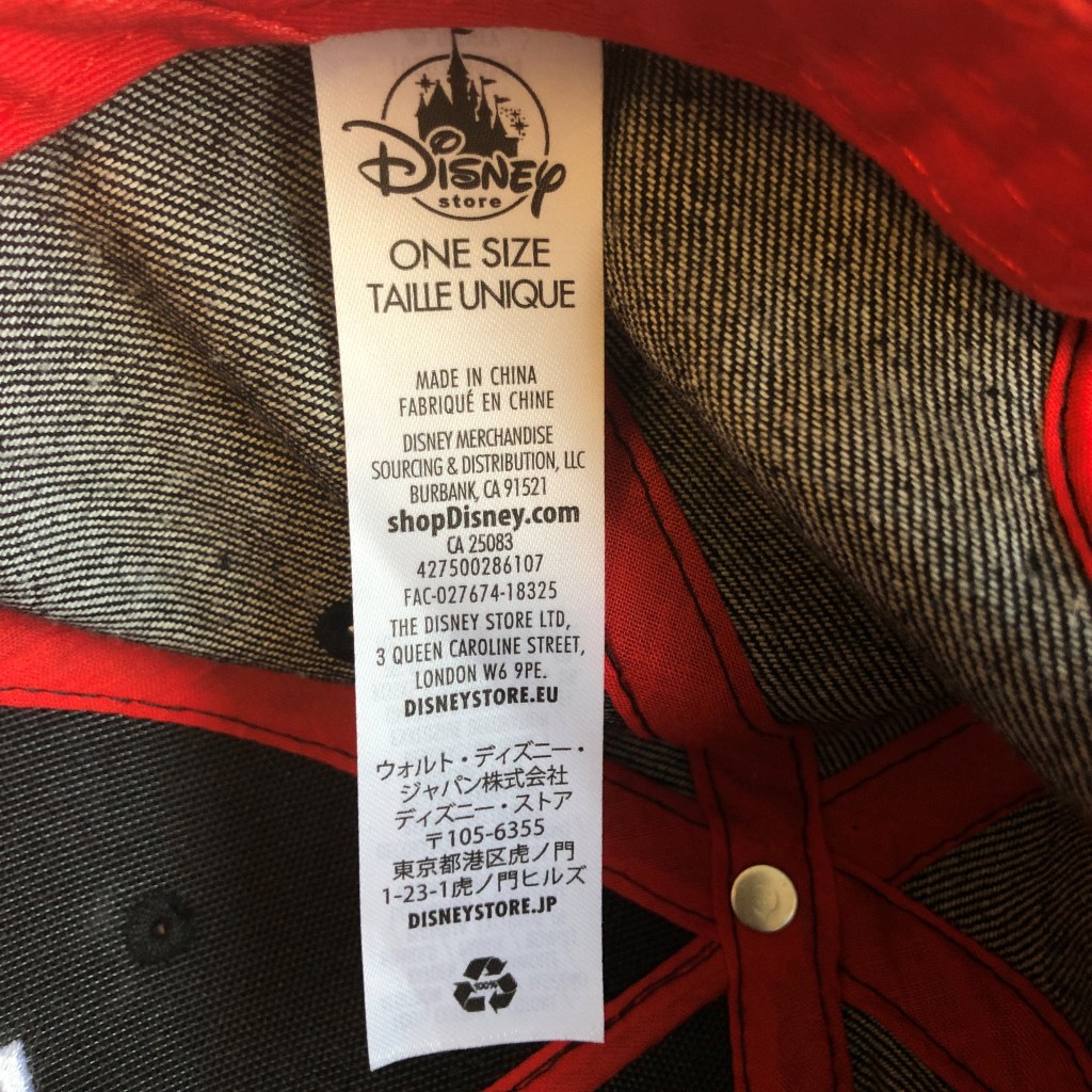 This cap was released by the Disney Parks line and so was likely originally sold in the Parks, but also later in the Disney Store locations that are allowed to liquidate old Park stock. This cap is sized as ‘Adult’.