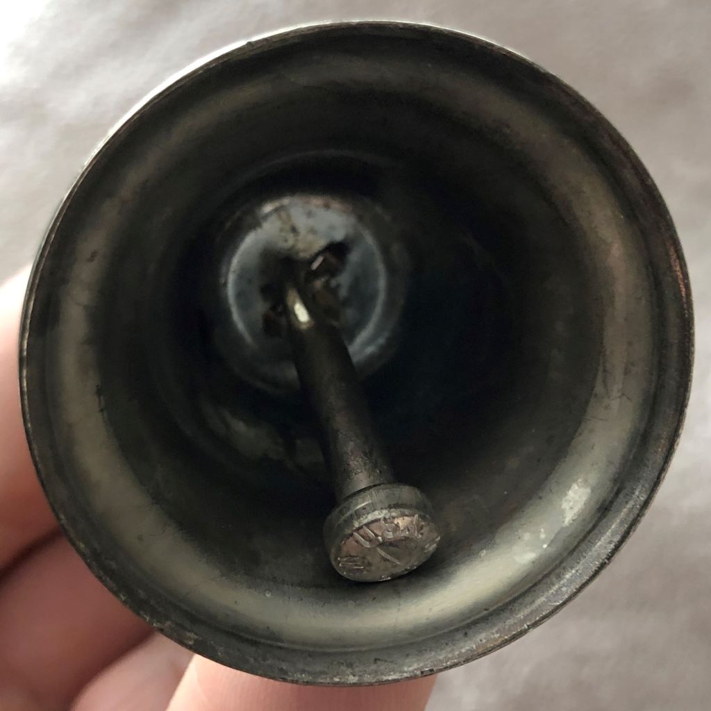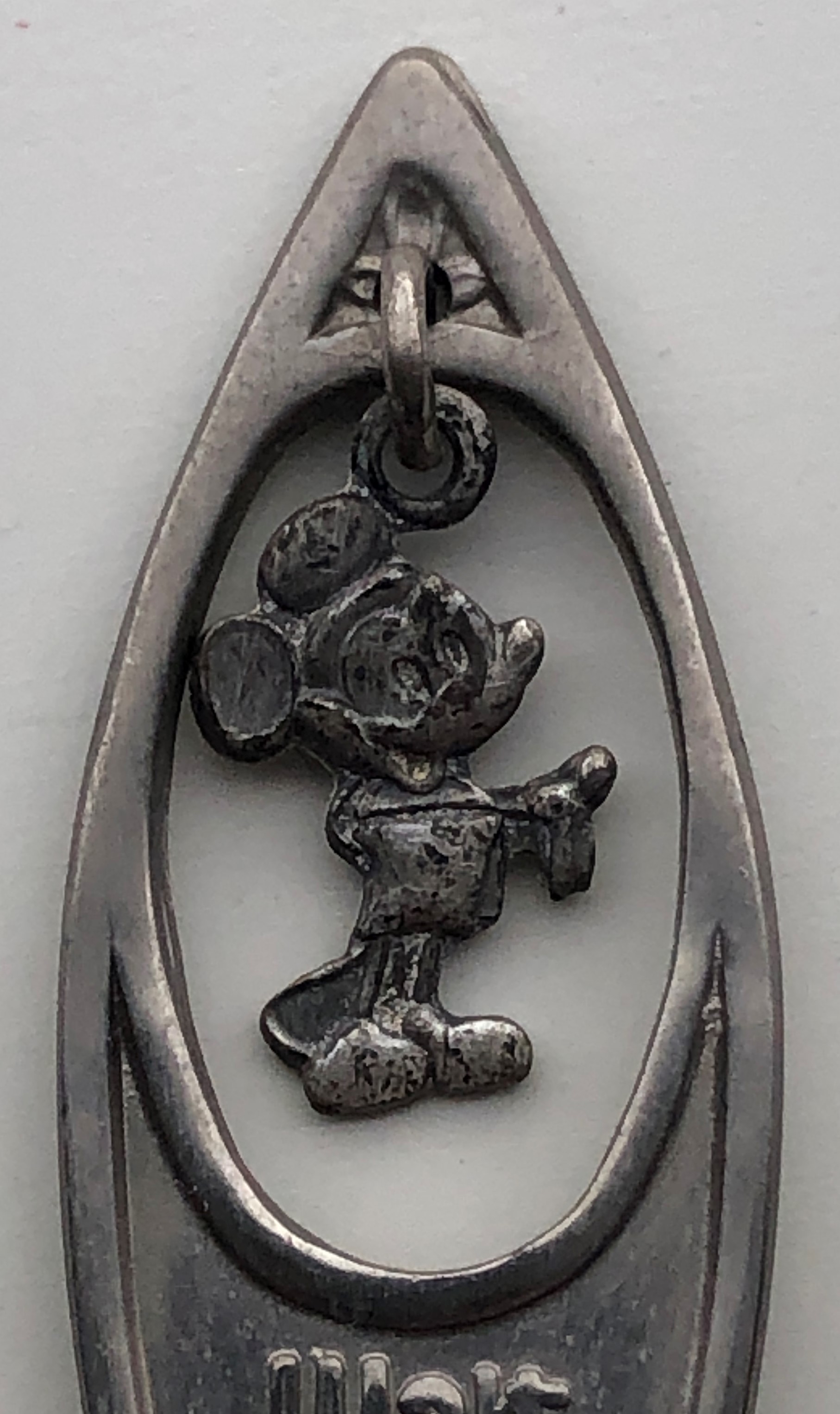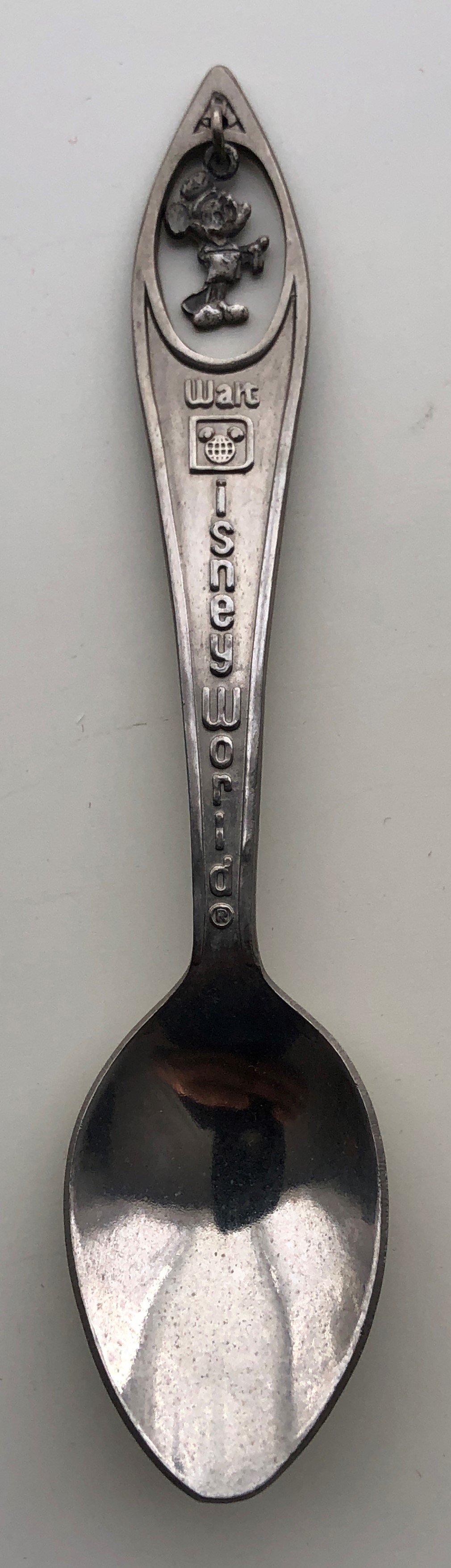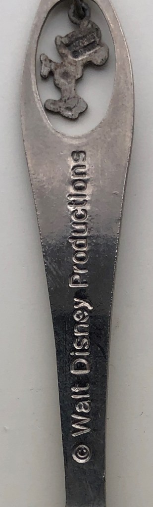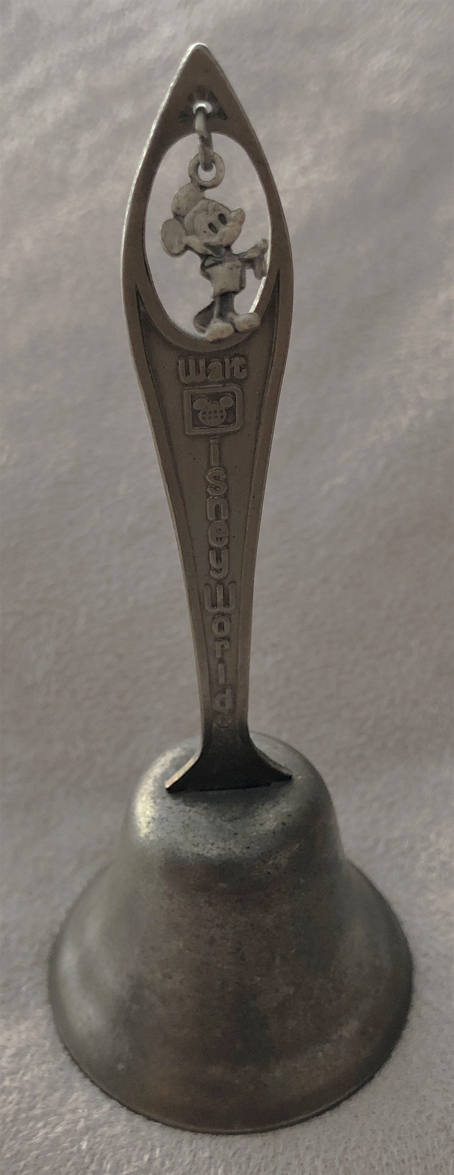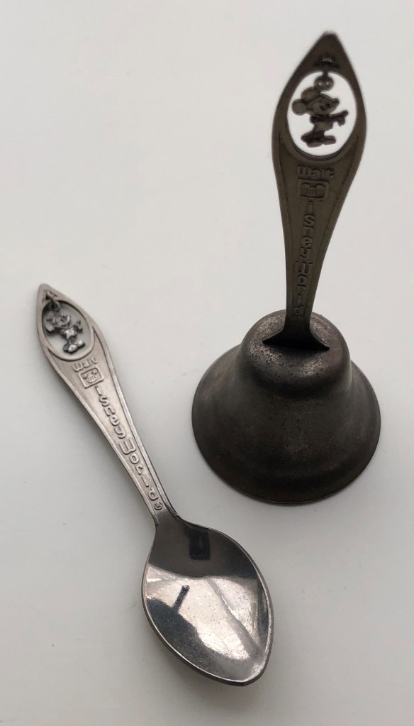 This Walt Disney World logo helps us to date the pieces although with a wide spread of years: The complex in Florida used this logo (the ‘D’ encircling the globe) from 1971 to 1996. So this spoon and bell could have been produced within this time, but I would narrow it down to during the 70’s or very early 80’s. Why?