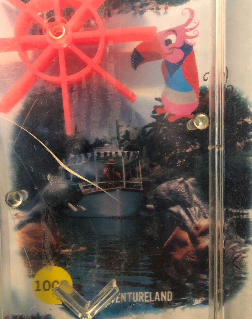 Can we more accurately date this game? We can date it earlier than 1995 because it’s stamped with the Walt Disney Productions trademark which was used only up until 1986. We can date the game as being still earlier as the Pirate Ship began its final voyage into history around 1981, being completely gone from the Park in 1982.