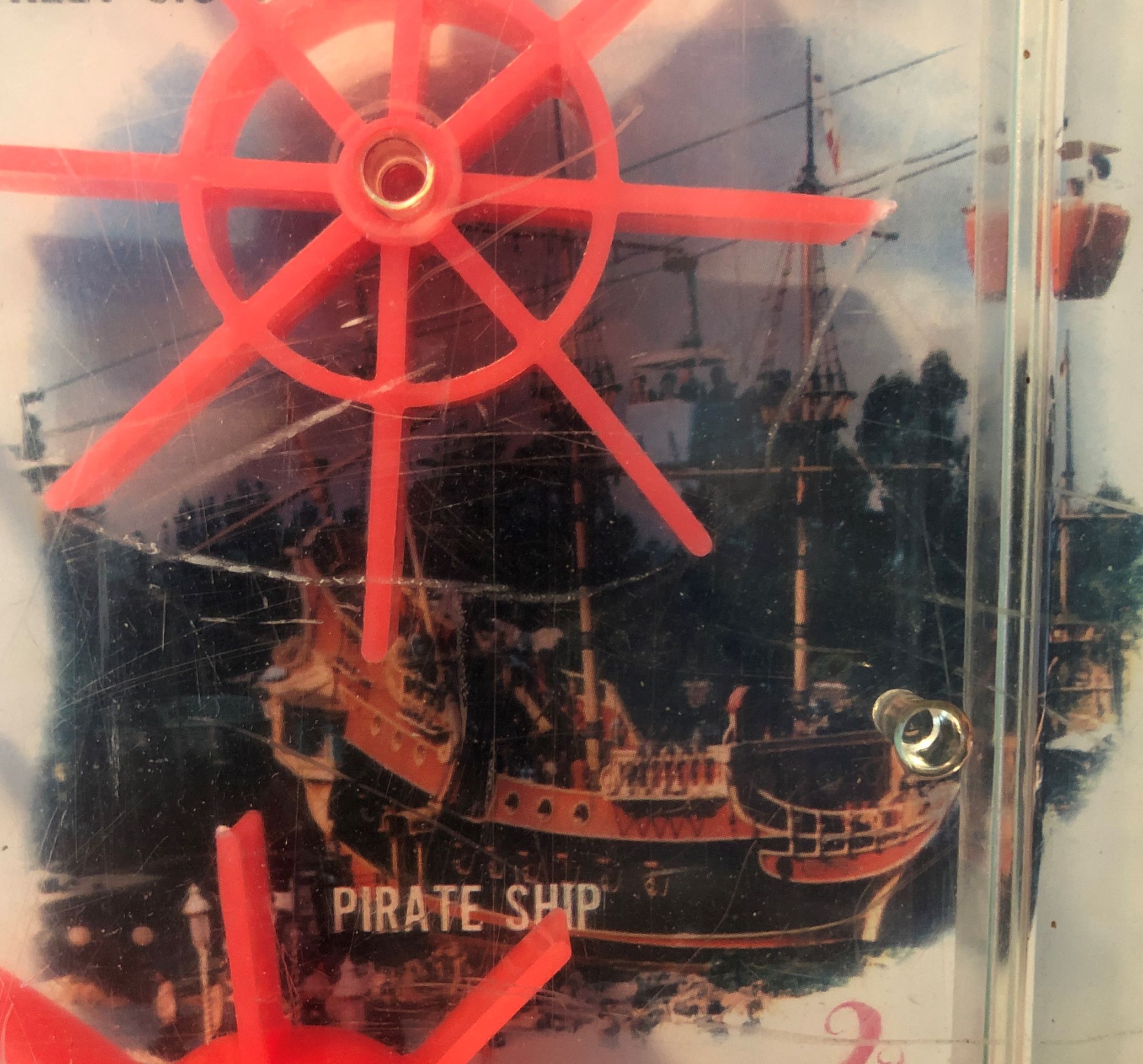Can we more accurately date this game? We can date it earlier than 1995 because it’s stamped with the Walt Disney Productions trademark which was used only up until 1986. We can date the game as being still earlier as the Pirate Ship began its final voyage into history around 1981, being completely gone from the Park in 1982.