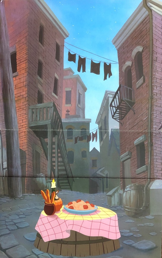 Shortly after removing Lady’s muzzle, Tramp begins to show her around ‘his’ city. And when it’s time to eat: