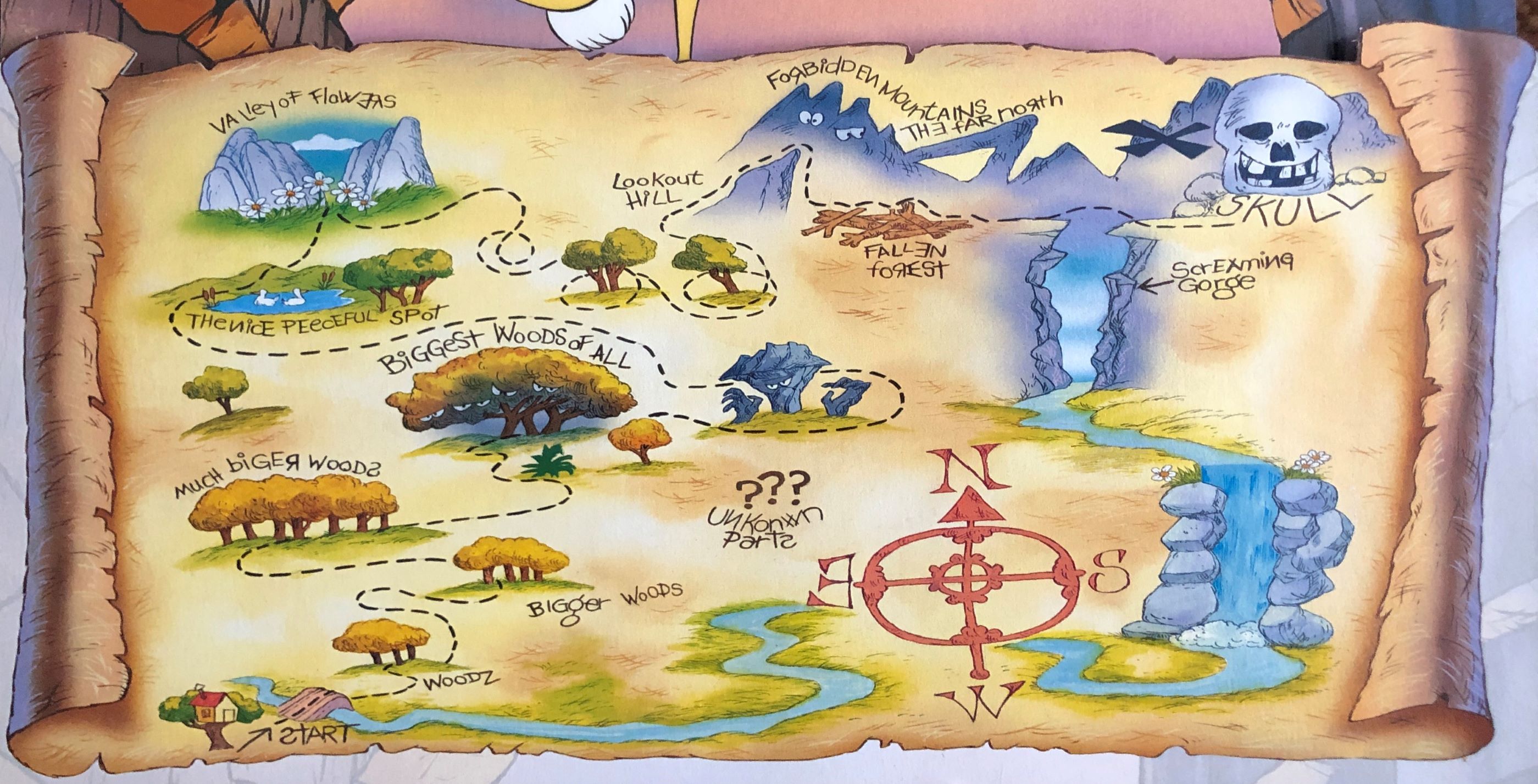 When you fold up the flap that Tigger is on it forms the bottom of the folder which keeps the prints in place. And it reveals this wonderful map showing the locations that are visited in the movie: