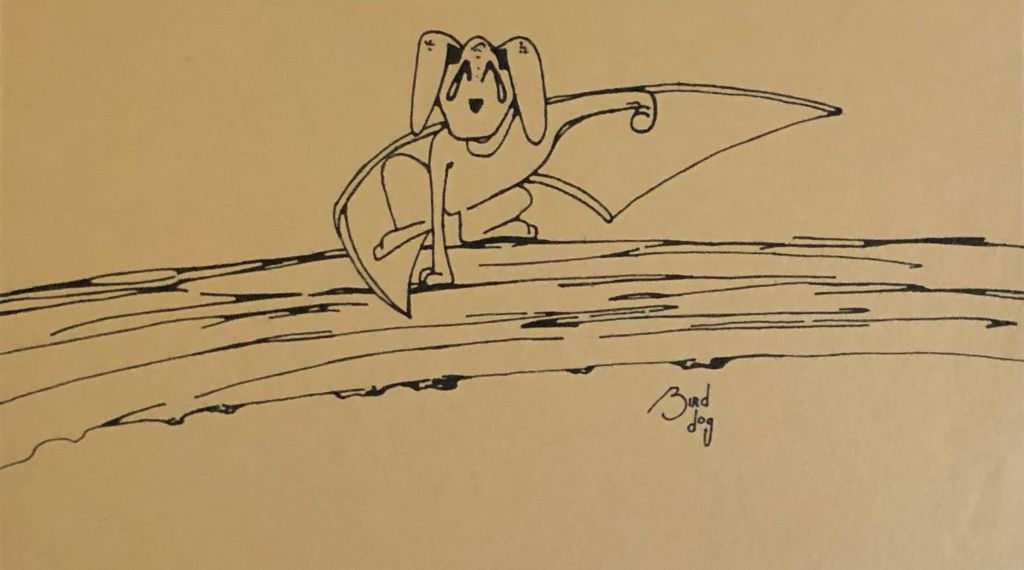 At the time I was developing my own style for drawing tree bark. I used a modified version, with straighter lines and wider spacing, for rock faces. So this little dog was just there to give me an excuse to draw another tree: