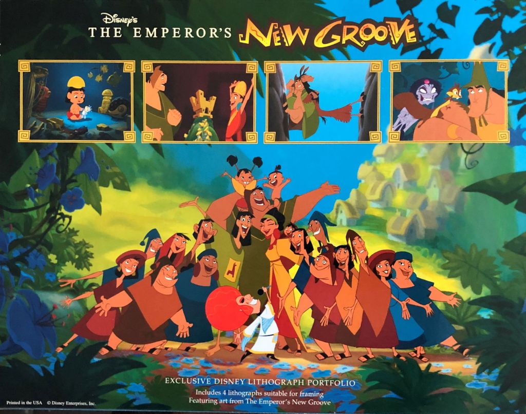 The Disney Store strikes again with another fine set of lithographs to promote the 2000 release of The Emperor’s New Groove. Let’s get right to it (because Emperor Kuzco is a bit impatient) and check out the cover of the folder:
