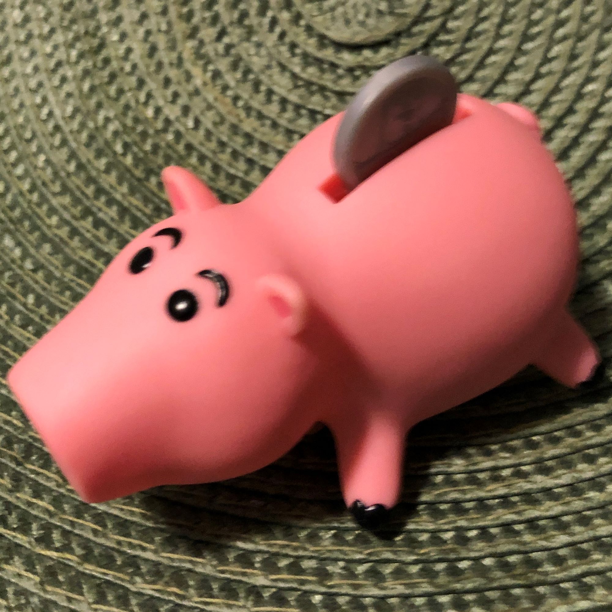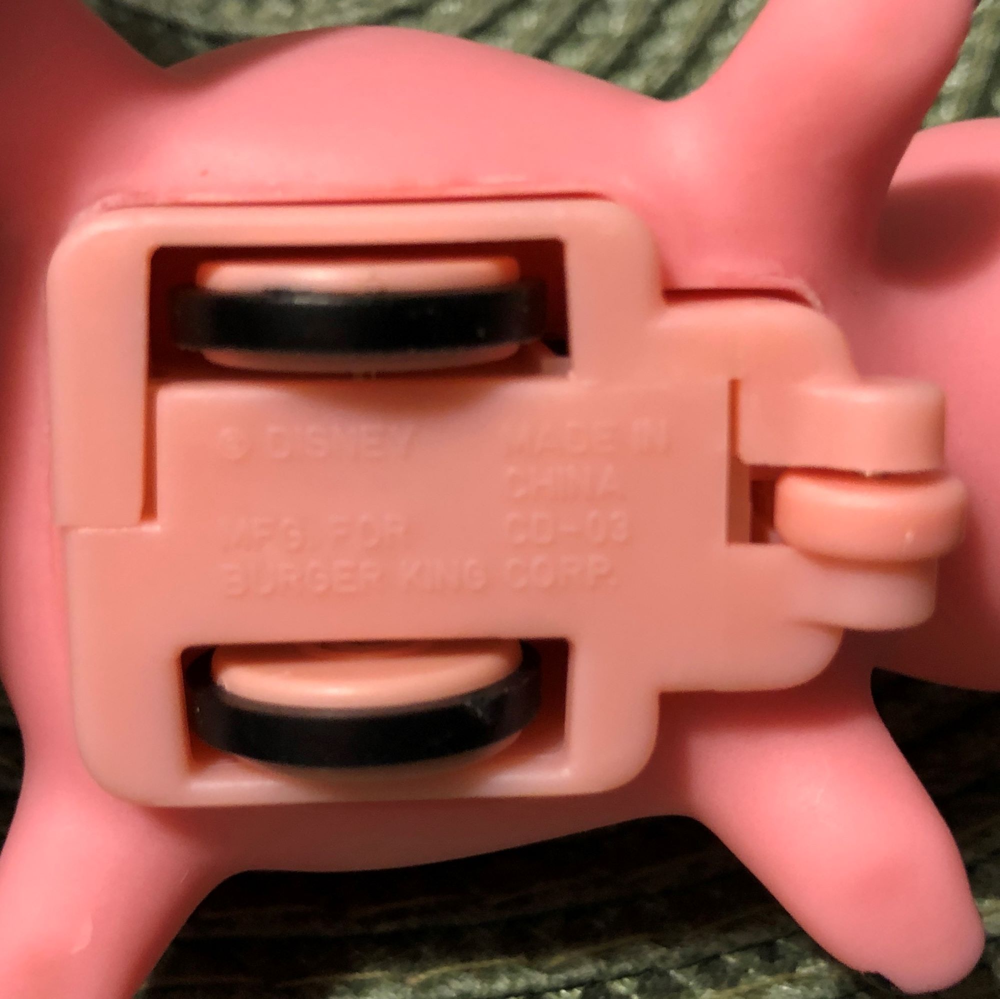 Hamm is also a racer-type toy. When you press down on the coin on his back, he shoots away! And he’s fast! The coin has an image of Buzz Lightyear on one side and the Star Command insignia on the other.